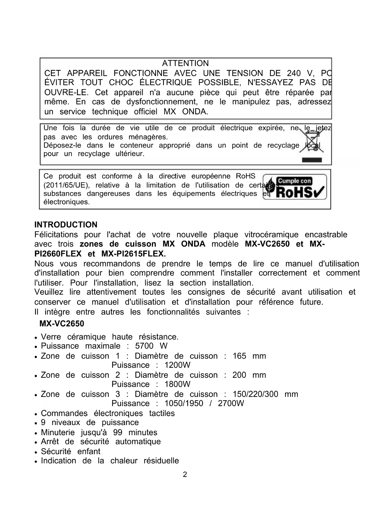 ATTENTION CET APPAREIL FONCTIONNE AVEC UNE TENSION DE 240 V, POUR ÉVITER TOUT CHOC ÉLECTRIQUE POSSIBLE, N'ESSAYEZ PAS DE OUVRE-LE. Cet appareil n'a aucune pièce qui peut être réparée par vous- même. En cas de dysfonctionnement, ne le manipulez pas, adressez-vous à un service technique officiel MX ONDA. Une fois la durée de vie utile de ce produit électrique expirée, ne le jetez pas avec les ordures ménagères. Déposez-le dans le conteneur approprié dans un point de recyclage local pour un recyclage ultérieur. Ce produit est conforme à la directive européenne RoHS (2011/65/UE), relative à la limitation de l'utilisation de certaines substances dangereuses dans les équipements électriques et électroniques. INTRODUCTION Félicitations pour l'achat de votre nouvelle plaque vitrocéramique encastrable avec trois zones de cuisson MX ONDA modèle MX-VC2650 et MX- PI2660FLEX et MX-PI2615FLEX. Nous vous recommandons de prendre le temps de lire ce manuel d'utilisation et d'installation pour bien comprendre comment l'installer correctement et comment l'utiliser. Pour l'installation, lisez la section installation. Veuillez lire attentivement toutes les consignes de sécurité avant utilisation et conserver ce manuel d'utilisation et d'installation pour référence future. Il intègre entre autres les fonctionnalités suivantes : MX-VC2650 Verre céramique haute résistance. Puissance maximale : 5700 W Zone de cuisson 1 : Diamètre de cuisson : 165 mm Puissance : 1200W Zone de cuisson 2 : Diamètre de cuisson : 200 mm Puissance : 1800W Zone de cuisson 3 : Diamètre de cuisson : 150/220/300 mm Puissance : 1050/1950 / 2700W Commandes électroniques tactiles 9 niveaux de puissance Minuterie jusqu'à 99 minutes Arrêt de sécurité automatique Sécurité enfant Indication de la chaleur résiduelle3 MX-PI2660 FEX Verre céramique à haute résistance. Puissance maximale : 6600 W Fonctionnement en mode autonome avec 3 zones de cuisson ou en mode FLEX qui combine les deux zones de cuisson gauche pour obtenir une grande surface de cuisson : Fonctionnement en mode autonome : Zone 1 (en haut à gauche) : 180 mm de diamètre de cuisson, puissance 1300 W (mode turbo 1500 W) Zone 2 (en bas à gauche) : 180 mm de diamètre de cuisson, puissance 1900 W (mode turbo 2200 W) Zone 3 (zone droite) : 280 mm de diamètre de cuisson, puissance 2300W (mode turbo 3000 W) Fonctionnement en mode FLEX : Zone gauche : surface de cuisson 180 x 380 mm, puissance 3000 W (mode turbo 3600 W) Commandes électroniques tactiles avec indicateur de chaleur résiduelle 9 niveaux de puissance + fonction turbo Chauffage continu à faible puissance Détection de récipients de petite taille ou sans induction Arrêt de sécurité automatique et verrouillage enfant MX-PI2615 FEX Verre céramique à haute résistance. Puissance maximale : 3600 W Fonctionnement en mode autonome avec 2 zones de cuisson ou en mode FLEX qui combine les deux zones de cuisson gauche pour obtenir une grande surface de cuisson : Fonctionnement en mode autonome : Zone 1 (en haut à gauche) : 180 mm de diamètre de cuisson, puissance 1300 W (mode turbo 1500 W) Zone 2 (en bas à gauche) : 180 mm de diamètre de cuisson, puissance 1900 W (mode turbo 2200 W) Fonctionnement en mode FLEX :4 Zone gauche : surface de cuisson 180 x 380 mm, puissance 3000 W (mode turbo 3600 W) Commandes électroniques tactiles avec indicateur de chaleur résiduelle 9 niveaux de puissance + fonction turbo Chauffage continu à faible puissance Détection de récipients de petite taille ou sans induction Arrêt de sécurité automatique et verrouillage enfant