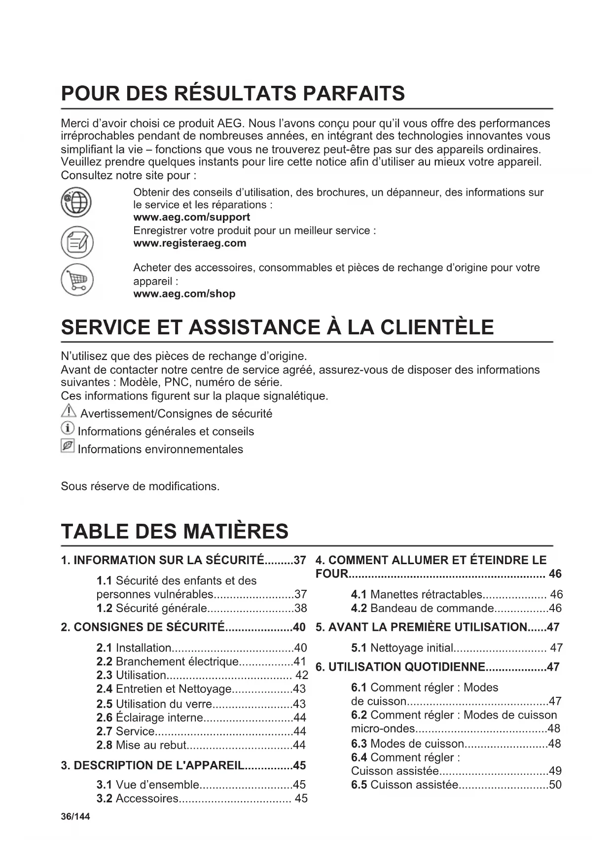 Merci d’avoir choisi ce produit AEG. Nous l’avons conçu pour qu’il vous offre des performances irréprochables pendant de nombreuses années, en intégrant des technologies innovantes vous simplifiant la vie – fonctions que vous ne trouverez peut-être pas sur des appareils ordinaires. Veuillez prendre quelques instants pour lire cette notice afin d’utiliser au mieux votre appareil. Consultez notre site pour : Obtenir des conseils d’utilisation, des brochures, un dépanneur, des informations sur le service et les réparations : www.aeg.com/support Enregistrer votre produit pour un meilleur service : www.registeraeg.com Acheter des accessoires, consommables et pièces de rechange d’origine pour votre appareil : www.aeg.com/shop