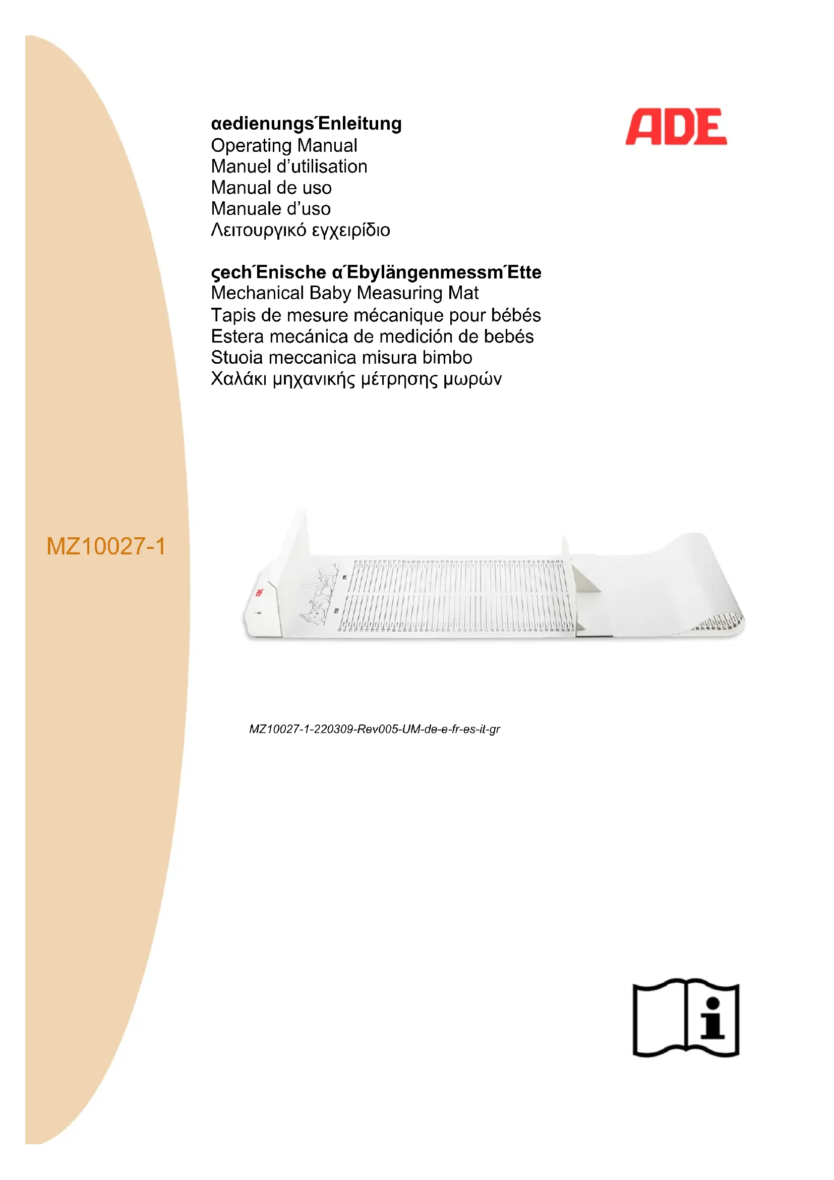 Prise de mesure - Placez le bébé sur le matelas fixé en toute sécurité. - Afin d’obtenir les meilleurs résultats possibles, assurez-vous que la tête du bébé a bien été placée au plus près de la partie du tapis réservée à la tête. - Avec votre main droite, étirez doucement les jambes du bébé en appuyant légèrement vers le bas sur les genoux. - La partie du tapis réservée aux pieds doit être déplacée à l’horizontale vers les pieds du bébé. - Le résultat des mesures peut être lu en cm, directement à partir du tapis de mesure. Pour une sécurité accrue et pour de meilleurs résultats de mesure, il est conseillé que les mesures et la manipulation du bébé soient effectuées par deux personnes.MZ10027-1-220309-Rev005-UM-de-e-fr-es-it-gr