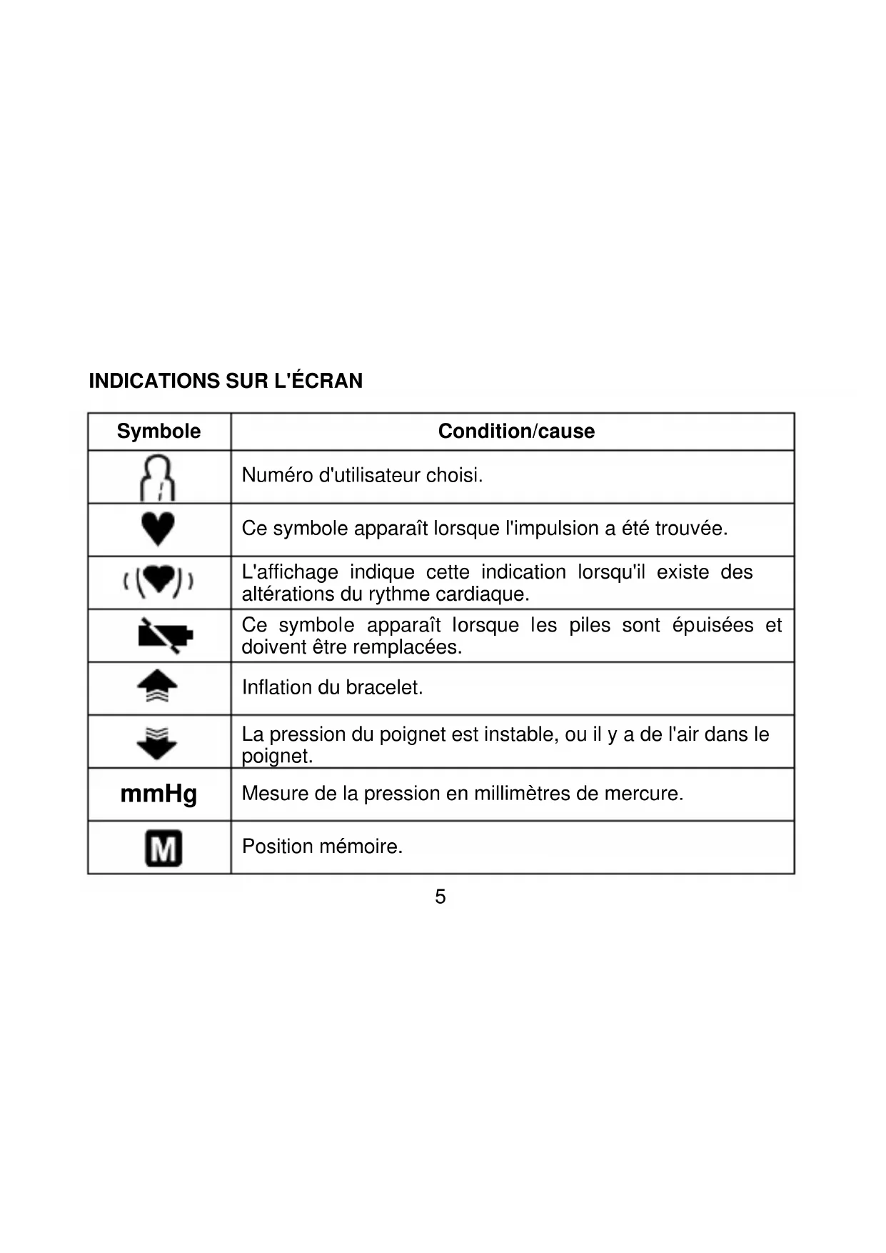 Position mémoire.6 CONSEILS DE BASE POUR L'UTILISATION DU TENSIOMÈTRE Mesurer dans un environnement calme et dans une position détendue. Effectuer la mesure en cas de stress, entraîne des changements dans la tension artérielle. Restez immobile, calmez-vous et reposez-vous pendant 5 minutes avant de mesurer votre tension artérielle. N'utilisez pas le tensiomètre lorsque vous avez une blessure au poignet. Si vous l'utilisez avec des personnes atteintes d'une infection cutanée ou d'une plaie, vous devez d'abord désinfecter le bracelet. Les valeurs mesurées peuvent varier (lecture inexacte), selon la position du tensiomètre. Devrait être placé à l'intérieur du poignet et au niveau du cœur Essayez de toujours mesurer la pression sanguine toujours à la même heure du jour. Évitez de déplacer le poignet et de ne pas parler pendant la mesure car cela peut entraîner des erreurs de lecture. Placez la poignet afin qu'elle s'enroule bien autour du poignet, mais jamais trop serrer, n'oubliez pas de gonfler pendant le fonctionnement. Ne placez pas le tensiomètre sur les vêtements (chemise, pull, blouse, etc.), car l'appareil ne peut pas mesurer à travers les textiles. Dans des cas exceptionnels, il se peut qu'une impulsion irrégulière ou très faible n'autorise pas à effectuer les mesures. Si oui, parlez-en à votre médecin ou à A.T.S.7 Desserrez la poignet immédiatement après une mesure prolongée. En utilisant correctement cet appareil, la pression sanguine mesurée correspond à celle obtenue par la méthode de l'auscultation du stéthoscope. Après la mesure de la tension artérielle, si vous souhaitez effectuer une nouvelle mesure, vous devriez attendre 3 à 5 minutes, de sorte que la circulation sanguine revienne à la normale. Gardez à l'esprit que pendant les mesures quotidiennes de la pression artérielle, les valeurs quotidiennes dépendent de nombreux facteurs. Ainsi, la consommation de tabac, d'alcool, de drogues ou d'effort corporel influence les valeurs prises dans une large mesure. Restez détendu et dans un environnement calme au moins 30 minutes avant de prendre des mesures. Les valeurs de la pression artérielle doivent être interprétées par un médecin ou A.T.S. familier avec l'histoire du patient. En mesurant régulièrement la tension artérielle, le médecin ou le A.T.S peuvent effectuer un suivi plus approfondi du patient. La taille du bracelet est conçue pour une utilisation pour adultes. N'utilisez pas cet appareil avec des personnes qui ont des arythmies. Évitez les mesures à proximité d'appareils qui génèrent de forts champs magnétiques, tels que les téléphones mobiles, les fours à micro-ondes, etc.8