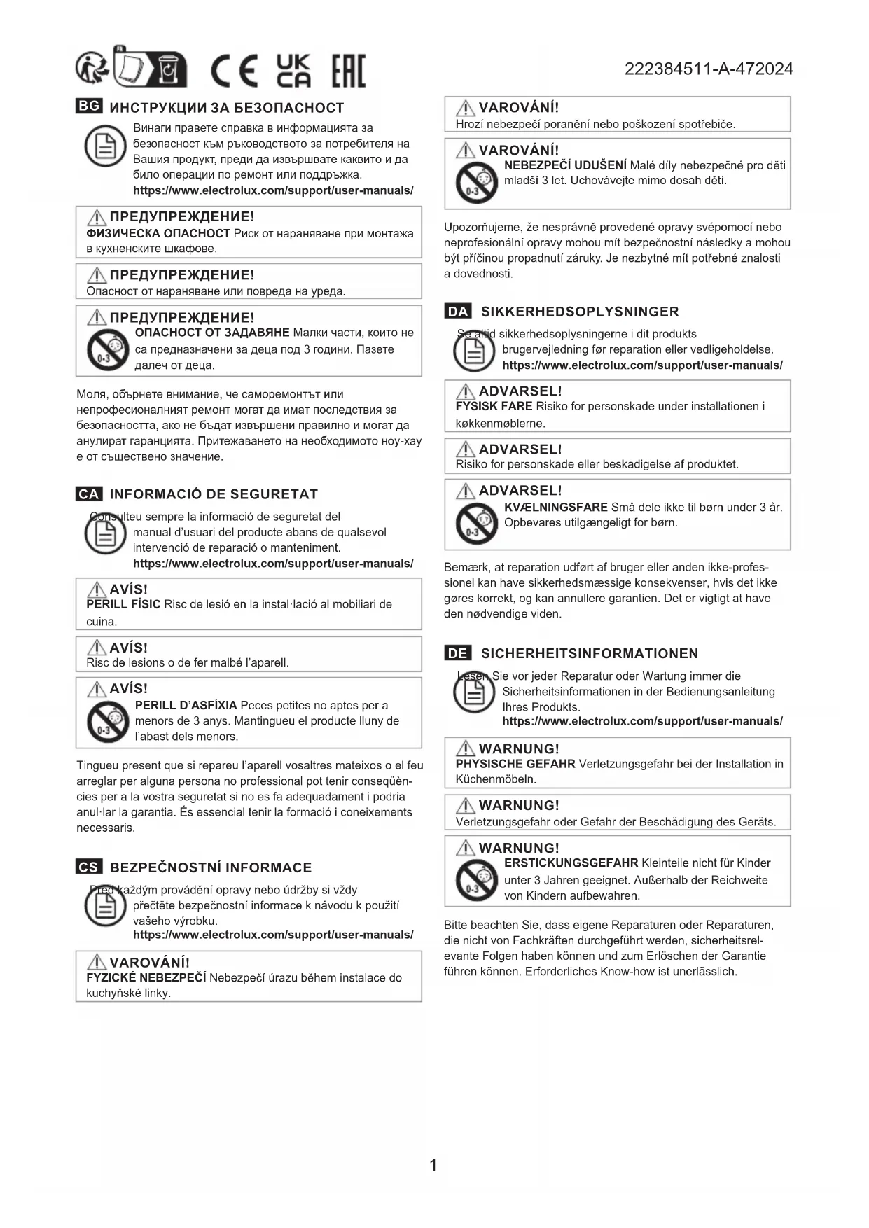 Reportez-vous toujours aux informations de sécurité du manuel d’utilisation de votre produit avant toute opération de réparation ou de maintenance. https://www.electrolux.com/support/user-manuals/ AVERTISSEMENT ! DANGER PHYSIQUE Risque de blessure lors de l’installation dans le mobilier de cuisine. AVERTISSEMENT ! Risque de blessure ou de dommages matériels. AVERTISSEMENT ! RISQUE D’ÉTOUFFEMENT Les petites pièces ne sont pas destinées aux enfants de moins de 3 ans. Tenir hors de la portée des enfants. Veuillez noter qu’une autoréparation ou une réparation non profes- sionnelle peuvent avoir des conséquences sur la sécurité si elle n’est pas eff ectuée correctement, et peut annuler la garantie. Il est essentiel de posséder le savoir-faire nécessaire.3