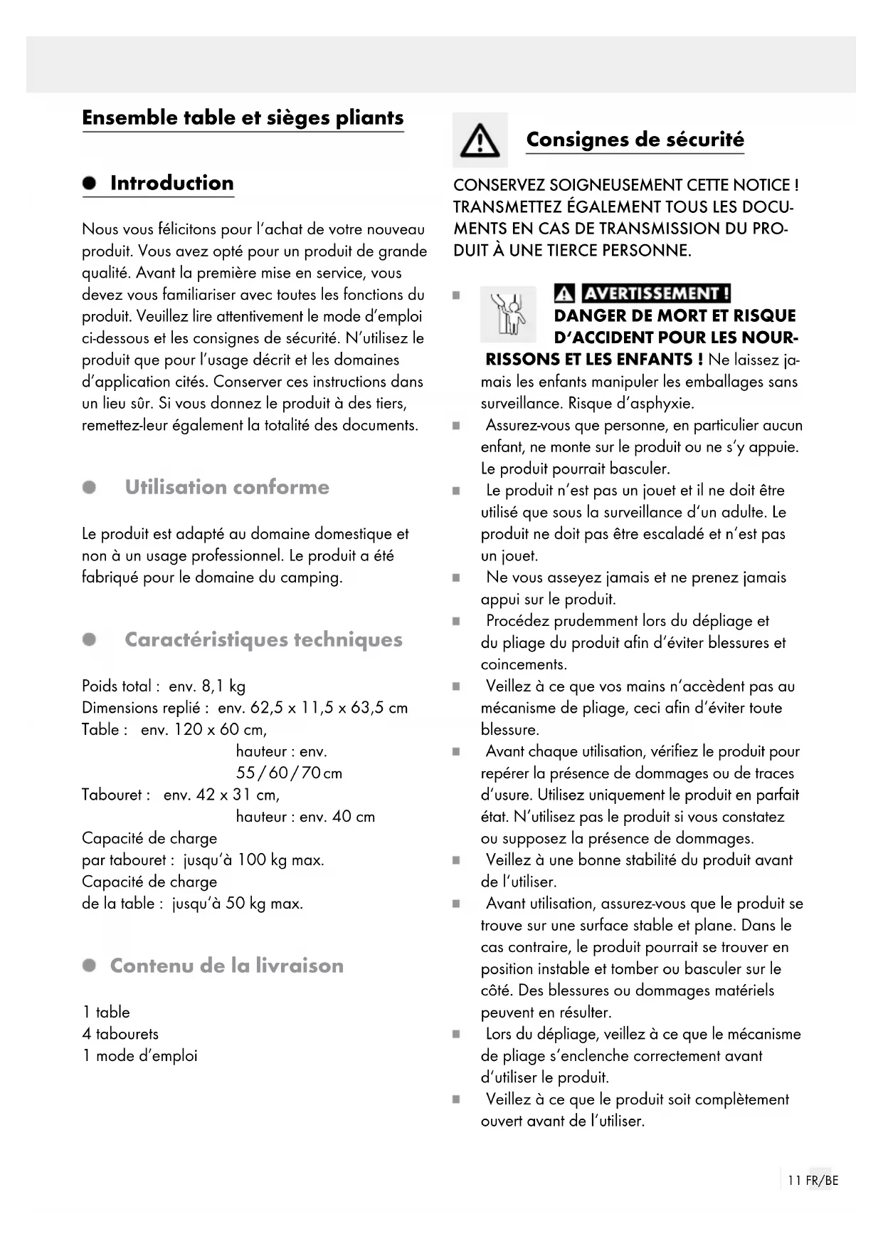 RISSONS ET LES ENFANTS! Ne laissez ja- mais les enfants manipuler les emballages sans surveillance. Risque d‘asphyxie. Assurez-vous que personne, en particulier aucun enfant, ne monte sur le produit ou ne s‘y appuie. Le produit pourrait basculer. Le produit n‘est pas un jouet et il ne doit être utilisé que sous la surveillance d‘un adulte. Le produit ne doit pas être escaladé et n‘est pas un jouet. Ne vous asseyez jamais et ne prenez jamais appui sur le produit. Procédez prudemment lors du dépliage et du pliage du produit afin d‘éviter blessures et coincements. Veillez à ce que vos mains n‘accèdent pas au mécanisme de pliage, ceci afin d‘éviter toute blessure. Avant chaque utilisation, vérifiez le produit pour repérer la présence de dommages ou de traces d‘usure. Utilisez uniquement le produit en parfait état. N‘utilisez pas le produit si vous constatez ou supposez la présence de dommages. Veillez à une bonne stabilité du produit avant de l‘utiliser. Avant utilisation, assurez-vous que le produit se trouve sur une surface stable et plane. Dans le cas contraire, le produit pourrait se trouver en position instable et tomber ou basculer sur le côté. Des blessures ou dommages matériels peuvent en résulter. Lors du dépliage, veillez à ce que le mécanisme de pliage s‘enclenche correctement avant d‘utiliser le produit. Veillez à ce que le produit soit complètement ouvert avant de l‘utiliser.12 FR/BE En cas de conditions météorologiques extrêmes, par ex. en cas de vent fort, sécurisez le produit. Utilisez le produit uniquement dans le cadre de son emploi prévu, comme meuble d‘extérieur dans le domaine du camping. Veuillez respecter la charge maximale (voir « Caractéristiques techniques »). Lorsque cette limite de poids est dépassée, il existe un risque de blessures et / ou de dommages matériels. Le montage simple et rapide du produit induit qu‘il n‘est pas aussi stable qu‘une table clas- sique. Ne chargez pas la table avec plus de 50 kg et évitez d‘exercer une charge latérale car cette table risquerait de basculer rapidement en raison de son faible poids, comparée à une table d‘extérieur ordinaire. N‘attachez pas de parasol à la table. Utilisez uniquement un parasol qui a sa propre armature. RISQUE DE DÉGÂTS MATÉRIELS ! Nous ne sommes en aucun cas responsables des accidents pouvant survenir en raison d‘une non-observation des remarques de sécurité exposées ci-dessus, ou en cas de manipulation incorrecte. Montage Déplier la table Retirez le produit de son emballage. Placez-le de manière à ce que les poignées de transport pointent vers le haut et ouvrez ensuite les fer- metures de la table repliée (voir ill. B). Dépliez la table avec précaution et posez-la devant vous sur le sol (voir ill. C). Ouvrez les sangles à fermeture à clip et retirez les quatre tabourets. Rabattez les pieds de table qui sont à l‘intérieur vers le haut de manière à enfoncer les équerres jusqu‘à ce qu‘elles soient encliquetées. Glissez ensuite les verrous de sécurité au centre des équerres (voir ill. D1). Ajustez maintenant la hauteur des pieds de table, comme représenté sur l‘illustration D2. Utilisez le mécanisme de fermeture et fermez les fermetures de manière à empêcher que la table ne se replie (voir ill. D3). Retournez la table et placez-la sur une surface plane. Ajuster la hauteur de table La table est réglable en hauteur sur 3 niveaux. Pour régler la hauteur souhaitée, encliquetez les dispositifs de verrouillage des quatre pieds de table à la même hauteur (voir ill. G). Utiliser les tabourets Sortez les tabourets de l‘emballage et dépliez-les, comme représenté sur l‘illustration E. Replier la table Pour replier la table, suivez les instructions du chapitre « Déplier la table » dans l‘ordre inverse. Placez les tabourets dans la table et fixez-les avec les sangles à fermeture à clip (voir ill. F). Repliez ensuite la table avec précaution et sécurisez-la avec les fermetures. Nettoyage et entretien Nettoyez le produit avec un chiffon humide im- bibé de détergent neutre. Laissez bien sécher toutes les pièces avant d‘emballer de nouveau le produit. Cela évite la formation de moisissure, les mauvaises odeurs et la décoloration. Rangement Entreposez le produit dans un endroit protégé et sec. Rangez le produit à l‘état propre et sec, et toujours à température ambiante.13 FR/BE Mise au rebut L’emballage se compose de matières recyclables pouvant être mises au rebut dans les déchetteries locales. Le produit est recyclable, soumis à la responsabilité élargie du fabricant et collecté séparément. Votre mairie ou votre municipalité vous renseigneront sur les possibilités de mise au rebut des produits usagés. Garantie Article L217-16 du Code de la consommation Lorsque l‘acheteur demande au vendeur, pendant le cours de la garantie commerciale qui lui a été consentie lors de l‘acquisition ou de la réparation d‘un bien meuble, une remise en état couverte par la garantie, toute période d‘immobilisation d‘au moins sept jours vient s‘ajouter à la durée de la garantie qui restait à courir. Cette période court à compter de la demande d‘intervention de l‘acheteur ou de la mise à disposition pour réparation du bien en cause, si cette mise à disposition est postérieure à la demande d‘intervention. Indépendamment de la garantie commerciale sous- crite, le vendeur reste tenu des défauts de conformité du bien et des vices rédhibitoires dans les conditions prévues aux articles L217-4 à L217-13 du Code de la consommation et aux articles 1641 à 1648 et 2232 du Code Civil. Article L217-4 du Code de la consommation Le vendeur livre un bien conforme au contrat et répond des défauts de conformité existant lors de la délivrance. Il répond également des défauts de conformité ré- sultant de l‘emballage, des instructions de montage