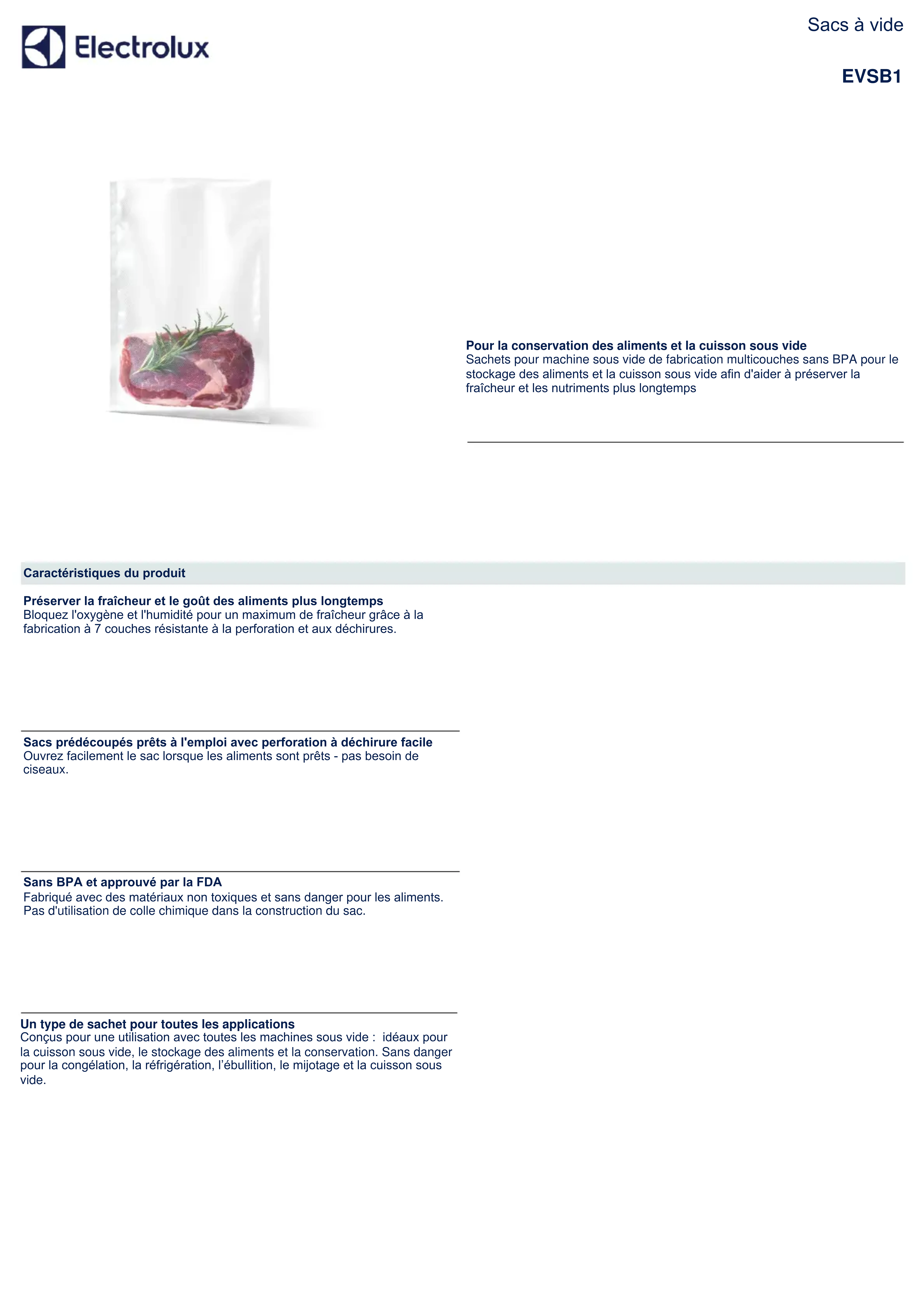 Un type de sachet pour toutes les applications Conçus pour une utilisation avec toutes les machines sous vide : idéaux pour la cuisson sous vide, le stockage des aliments et la conservation. Sans danger pour la congélation, la réfrigération, l’ébullition, le mijotage et la cuisson sous vide. Sacs prédécoupés prêts à l'emploi avec perforation à déchirure facile Ouvrez facilement le sac lorsque les aliments sont prêts - pas besoin de ciseaux. Sans BPA et approuvé par la FDA Fabriqué avec des matériaux non toxiques et sans danger pour les aliments. Pas d'utilisation de colle chimique dans la construction du sac. Préserver la fraîcheur et le goût des aliments plus longtemps Bloquez l'oxygène et l'humidité pour un maximum de fraîcheur grâce à la fabrication à 7 couches résistante à la perforation et aux déchirures. Pour la conservation des aliments et la cuisson sous vide Sachets pour machine sous vide de fabrication multicouches sans BPA pour le stockage des aliments et la cuisson sous vide afin d'aider à préserver la fraîcheur et les nutriments plus longtemps Caractéristiques du produit Sacs à vide EVSB1Numéro d'article / PNC