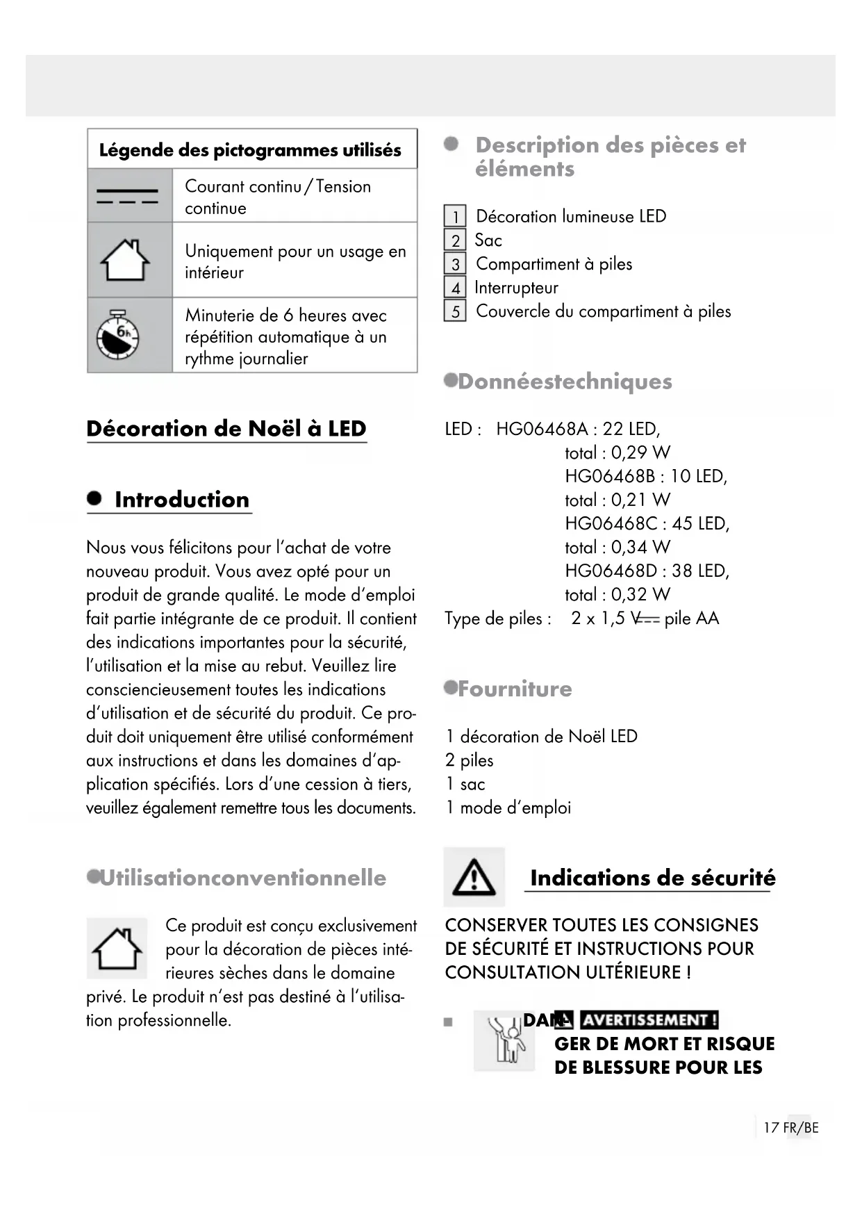 Couvercle du compartiment à piles Données techniques LED : HG06468A: 22 LED, total: 0,29 W HG06468B: 10 LED, total: 0,21 W HG06468C: 45 LED, total: 0,34 W HG06468D: 38 LED, total: 0,32 W Type de piles: 2 x 1,5 V pile AA Fourniture 1 décoration de Noël LED 2 piles 1 sac 1 mode d‘emploi Indications de sécurité