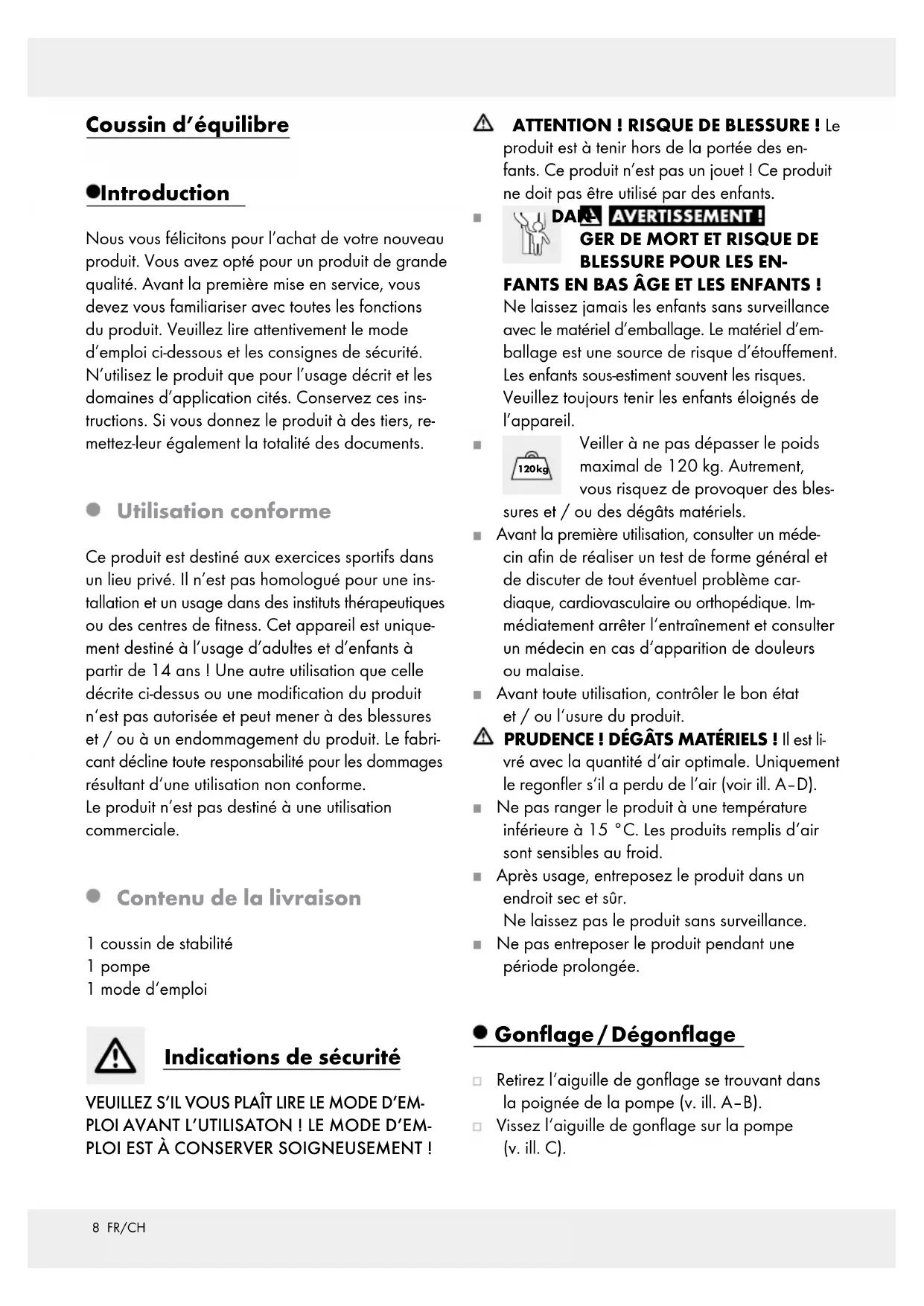 verfällt, wenn das Produkt beschädigt, nicht sach- gemäß benutzt oder gewartet wurde. Die Garantieleistung gilt für Material- oder Fabrika- tionsfehler. Diese Garantie erstreckt sich nicht auf Produktteile, die normaler Abnutzung ausgesetzt sind (z. B. Batterien) und daher als Verschleißteile ange- sehen werden können oder für Beschädigungen an zerbrechlichen Teilen, z. B. Schalter, Akkus oder die aus Glas gefertigt sind.8 FR/CH Coussin d’équilibre Introduction Nous vous félicitons pour l’achat de votre nouveau produit. Vous avez opté pour un produit de grande qualité. Avant la première mise en service, vous devez vous familiariser avec toutes les fonctions du produit. Veuillez lire attentivement le mode d’emploi ci-dessous et les consignes de sécurité. N’utilisez le produit que pour l’usage décrit et les domaines d’application cités. Conservez ces ins- tructions. Si vous donnez le produit à des tiers, re- mettez-leur également la totalité des documents. Utilisation conforme Ce produit est destiné aux exercices sportifs dans un lieu privé. Il n’est pas homologué pour une ins- tallation et un usage dans des instituts thérapeutiques ou des centres de fitness. Cet appareil est unique- ment destiné à l’usage d’adultes et d’enfants à partir de 14 ans ! Une autre utilisation que celle décrite ci-dessus ou une modification du produit n‘est pas autorisée et peut mener à des blessures et / ou à un endommagement du produit. Le fabri- cant décline toute responsabilité pour les dommages résultant d‘une utilisation non conforme. Le produit n’est pas destiné à une utilisation commerciale. Contenu de la livraison 1 coussin de stabilité 1 pompe 1 mode d‘emploi Indications de sécurité VEUILLEZ S’IL VOUS PLAÎT LIRE LE MODE D’EM- PLOI AVANT L’UTILISATON ! LE MODE D’EM- PLOI EST À CONSERVER SOIGNEUSEMENT ! ATTENTION ! RISQUE DE BLESSURE ! Le produit est à tenir hors de la portée des en- fants. Ce produit n’est pas un jouet ! Ce produit ne doit pas être utilisé par des enfants. DAN-