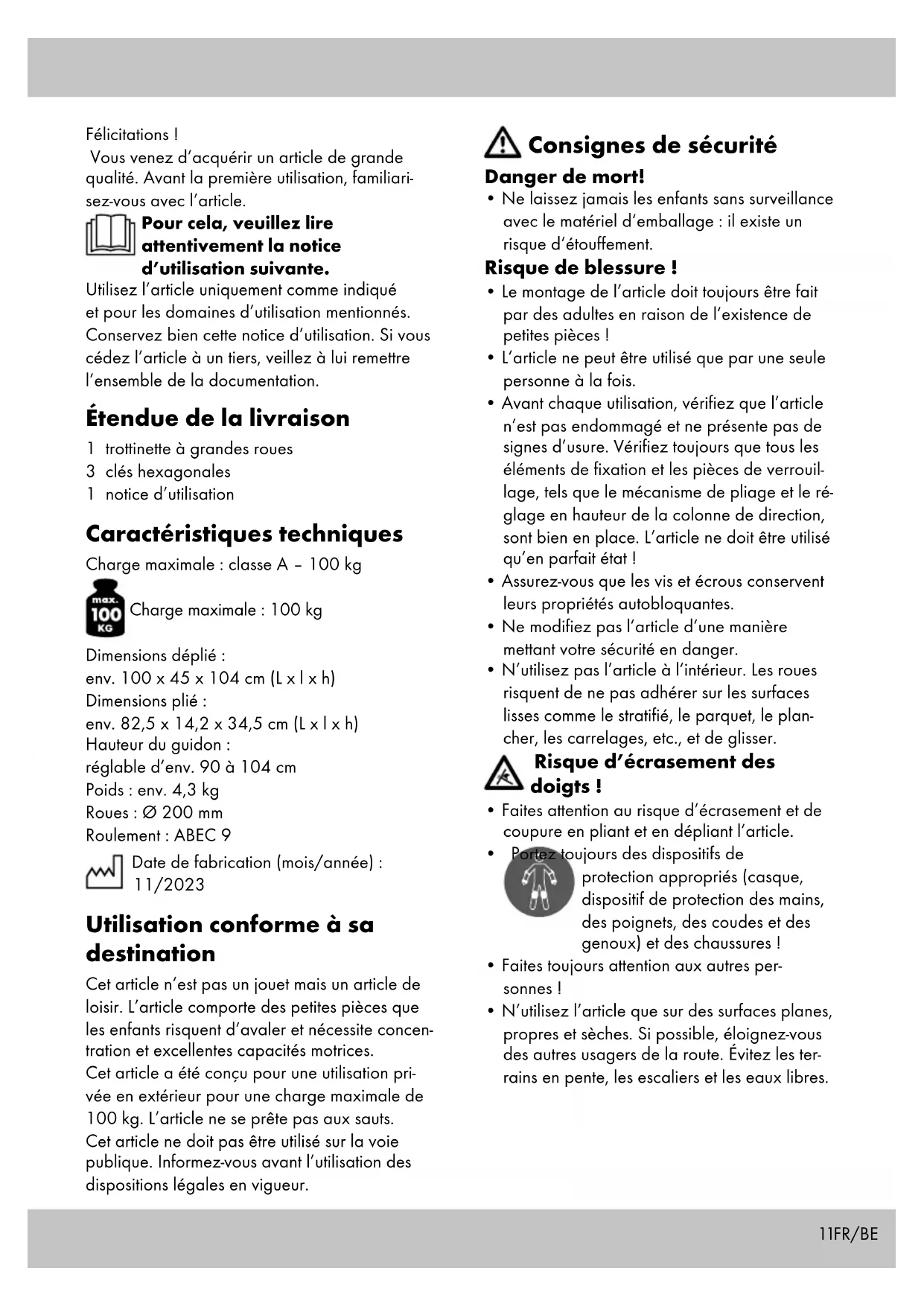 - Avant chaque utilisation, vérifiez que l’article n’est pas endommagé et ne présente pas de signes d’usure. Vérifiez toujours que tous les éléments de fixation et les pièces de verrouil- lage, tels que le mécanisme de pliage et le ré- glage en hauteur de la colonne de direction, sont bien en place. L’article ne doit être utilisé qu’en parfait état !