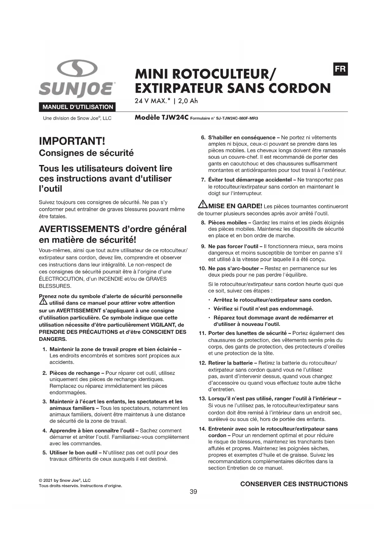 ES37Modèle TJW24C Formulaire n° SJ-TJW24C-880F-MR3 © 2021 by Snow Joe , LLCTous droits réservés. Instructions d’origine.