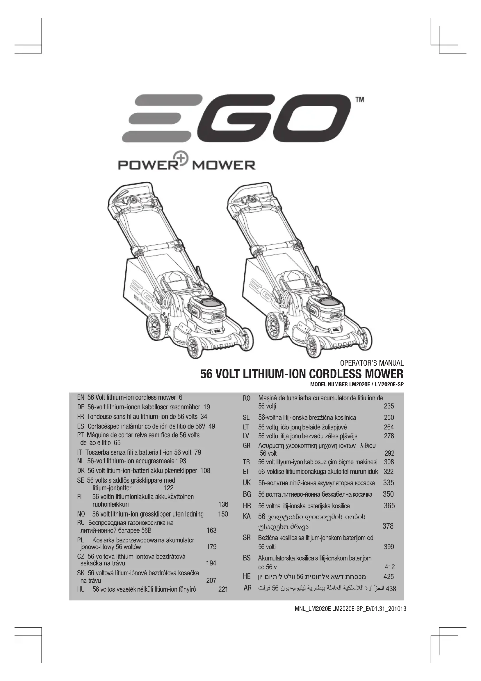 LM2020ESP - Tondeuse à gazon EGO - Notice d'utilisation et mode d'emploi gratuit