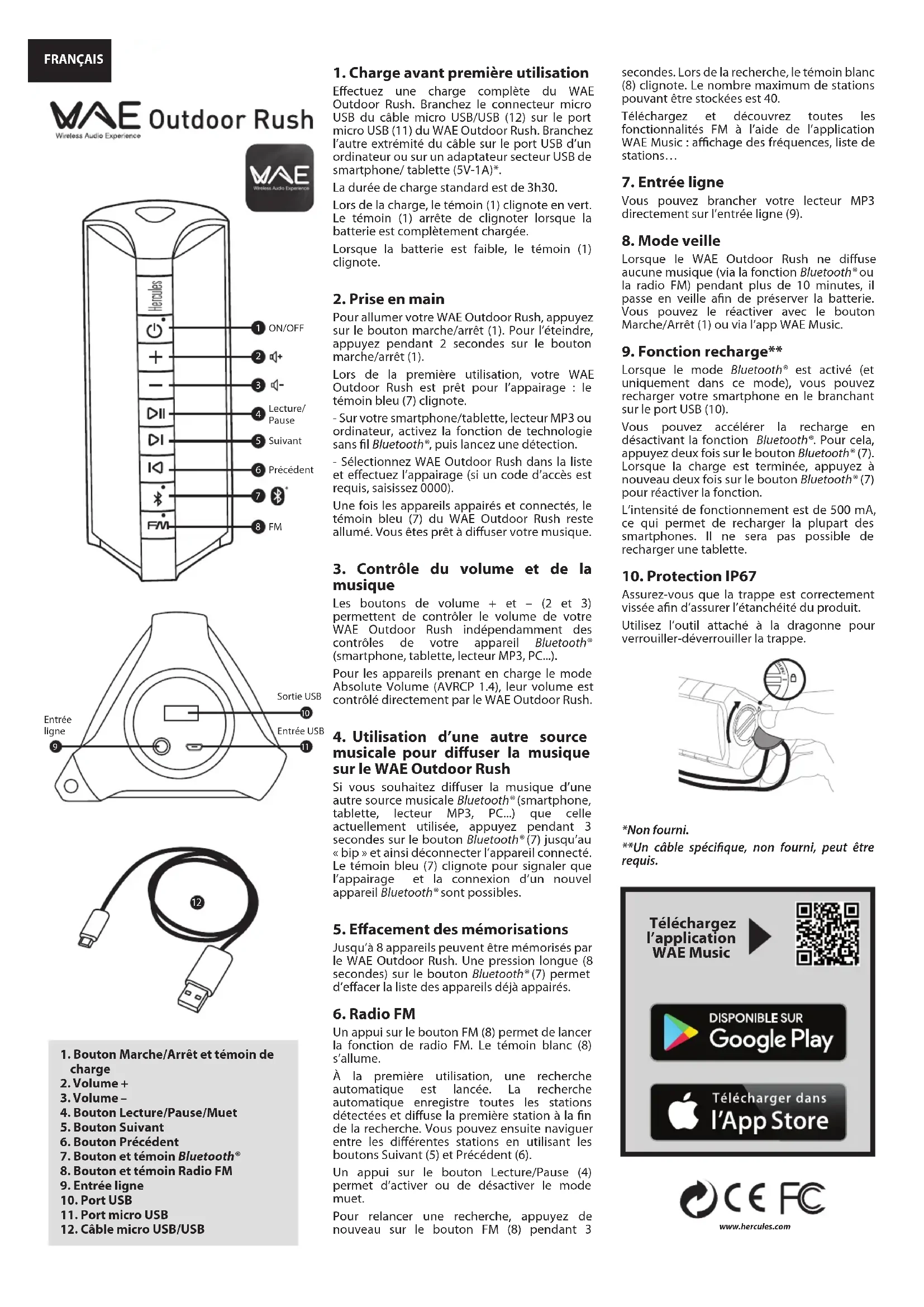 Sortie USB Entrée USB Entrée ligne Téléchargez l’application WAE MusicPANNEAU PRINCIPAL ET ENCEINTE WAE OUTDOOR RUSH CONNECTÉE Panneau principal Panneau principal en mode veille OPTIONSAUDIOFM Allumer/mettre en veille l’enceinte WAE Outdoor Rush à distance (le mode veille aecte l’autonomie de l’enceinte). Accéder aux informations de version de l’app, du rmware, au mode veille, etc. Information sur le niveau de batterie de l’enceinte WAE Outdoor Rush. Ouvrir le lecteur de musique. LECTEUR DEMUSIQUE Ouvrir le panneau d’égalisation (en mode Bluetooth® uniquement). OPTIONSAUDIO Accéder au manuel en ligne. MANUEL Rechercher l’enceinte WAE Outdoor Rush après une perte de connexion (ne s’ache qu’après une perte de connexion). BALAYAGEAUTO. Ouvrir le panneau de contrôle FM. FMVEILLEPANNEAU FM Zone d’achage de fréquence (de gauche à droite) : - Sélectionner la station précédente dans la liste des stations - Fréquence actuellement à l’écoute - Ouvrir le panneau des paramètres avancés FM - Sélectionner la station suivante dans la liste des stations. Achage des stations avec leur nom. Nécessite une géolocalisation. Achage du menu de gestion des stations après une pression longue sur une station : + : mémoriser dans une liste de favoris (Mem 1 ou Mem 2) X : eacer la station Contrôle du volume (sous Android™ uniquement). Boutons de sélection de liste (de gauche à droite) : - Liste des stations - Liste de favoris 1 - Liste de favoris 2 Lancer une géolocalisation et trouver la liste des stations disponibles. Nécessite l’activation du GPS et un accès Internet. Station actuellement à l’écoute. Nécessite une géolocalisation. Paramètres généraux FMPANNEAU FM Paramètres avancés FM Sélectionner manuellement une fréquence. Mémoriser la station. Bouton de retour au panneau précédent (sous iOS). Utiliser le bouton Retour sous Android. Rechercher automatiquement une station avant ou après la fréquence actuellement à l’écoute. Sélectionner les paramètres FM (Europe ou US). Une nouvelle recherche est requise après changement de ce paramètre. Activer/désactiver la mise à jour automatique des listes de favoris pendant une géolocalisation.