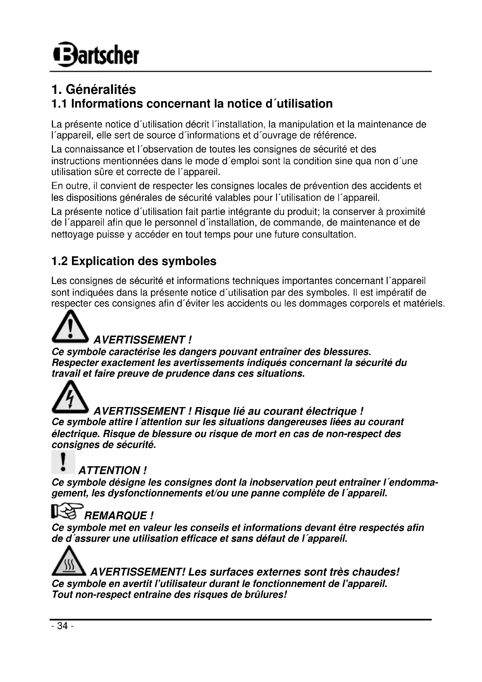 Les consignes de sécurité et informations techniques importantes concernant l´appareil sont indiquées dans la présente notice d´utilisation par des symboles. Il est impératif de respecter ces consignes afin d´éviter les accidents ou les dommages corporels et matériels. AVERTISSEMENT ! Ce symbole caractérise les dangers pouvant entraîner des blessures. Respecter exactement les avertissements indiqués concernant la sécurité du travail et faire preuve de prudence dans ces situations. AVERTISSEMENT ! Risque lié au courant électrique ! Ce symbole attire l´attention sur les situations dangereuses liées au courant électrique. Risque de blessure ou risque de mort en cas de non-respect des consignes de sécurité. ATTENTION ! Ce symbole désigne les consignes dont la inobservation peut entraîner l´endomma- gement, les dysfonctionnements et/ou une panne complète de l´appareil. REMARQUE ! Ce symbole met en valeur les conseils et informations devant être respectés afin de d´assurer une utilisation efficace et sans défaut de l´appareil. AVERTISSEMENT! Les surfaces externes sont très chaudes! Ce symbole en avertit l’utilisateur durant le fonctionnement de l’appareil. Tout non-respect entraine des risques de brûlures!- 35 - ATTENTION ! Champs magnétiques ! Ne pas ouvrir le cache arrière de l’appareil.