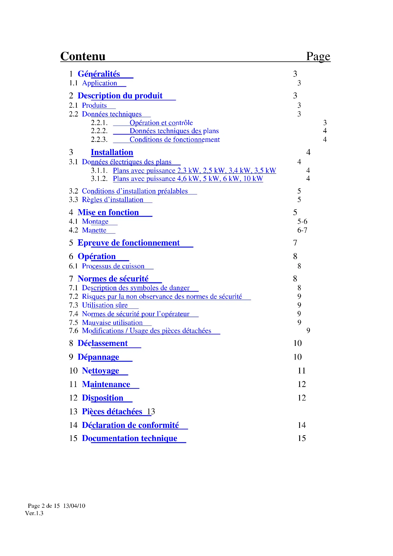8 Déclassement 10 9 Dépannage 10 10 Nettoyage 11 11 Maintenance 12 12 Disposition 12 13 Pièces détachées 13 14 Déclaration de conformité 14 15 Documentation technique 15Page 3 de 15 13/04/10 Ver.1.3
