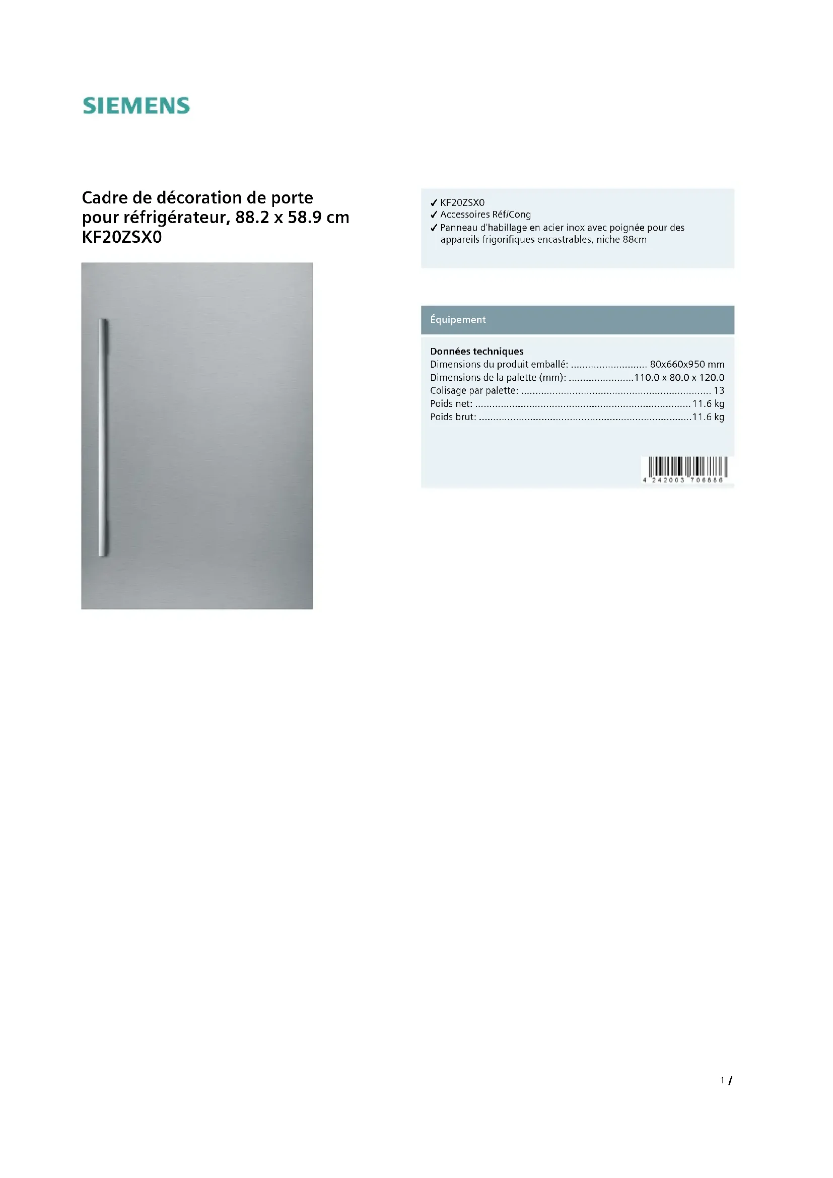 - Cadre de décoration de porte pour réfrigérateur, 88.2 x 58.9 cm KF20ZSX0 ✓ KF20ZSX0 ✓ Accessoires Réf/Cong ✓ Panneau d'habillage en acier inox avec poignée pour des appareils frigorifiques encastrables, niche 88cm Équipement Données techniques Dimensions du produit emballé: p. 80