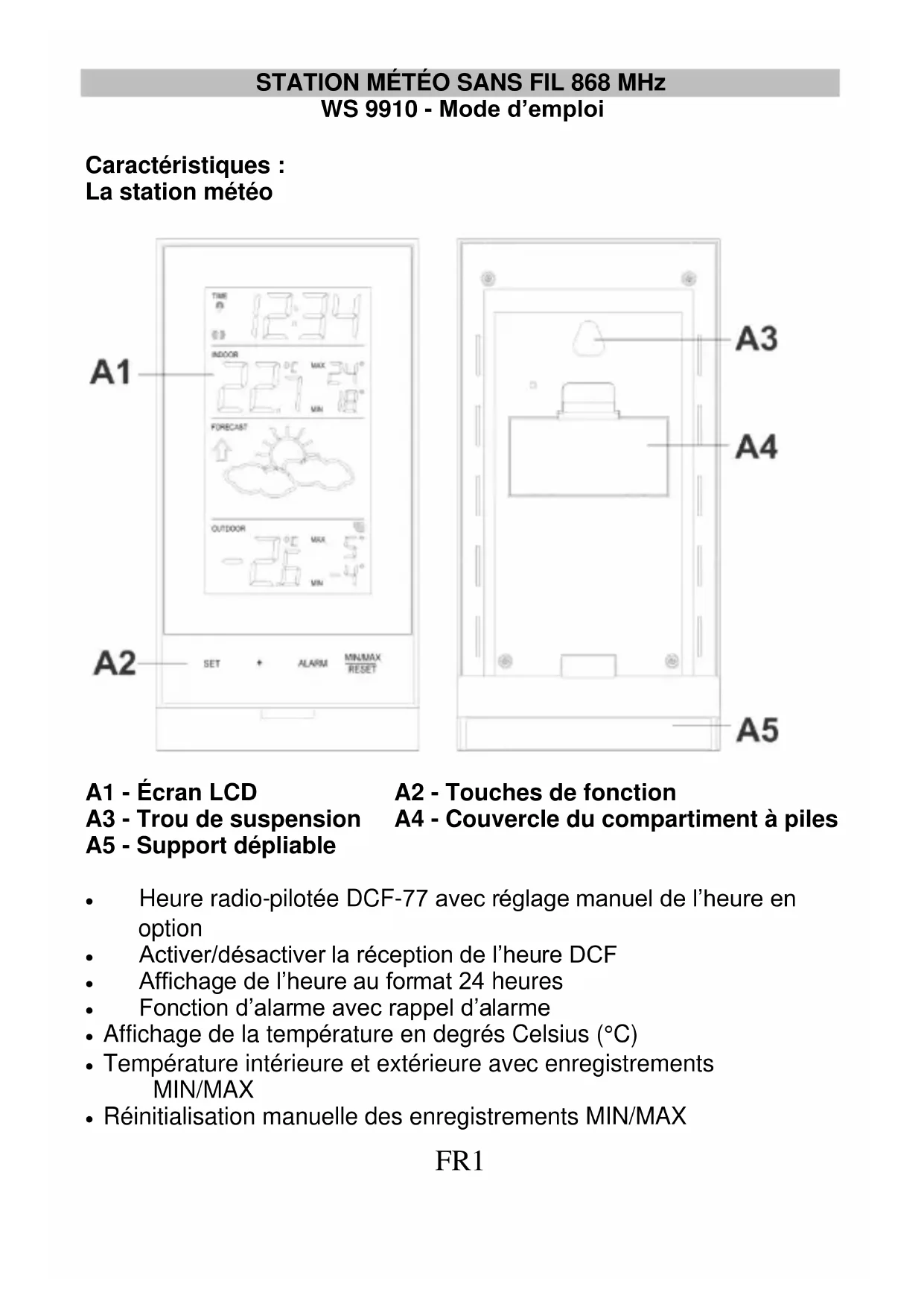 A1 - Écran LCD A2 - Touches de fonction A3 - Trou de suspension A4 - Couvercle du compartiment à piles A5 - Support dépliable Heure radio-pilotée DCF-77 avec réglage manuel de l’heure en option Activer/désactiver la réception de l’heure DCF Affichage de l’heure au format 24 heures Fonction d’alarme avec rappel d’alarme Affichage de la température en degrés Celsius (°C) Température intérieure et extérieure avec enregistrements MIN/MAX Réinitialisation manuelle des enregistrements MIN/MAXFR2 3 symboles de prévisions météo avec indicateur de tendance météo Transmission sans fil à 868 MHz Intervalles de réception du signal de 4 secondes Indicateur de piles faibles Montée au mur ou posée sur la table (support de table dépliable) Le capteur de température extérieure Transmission à distance de la température extérieure vers la station de température à 868 MHz Boîtier étanche à l’eau Montage mural et posé sur table Si le produit se trouve en Europe centrale, il trouve automatiquement le signal horaire radio-piloté. Au Royaume-Uni, il faut suivre la procédure de réglage manuel de l’heure. Installation : Remarque : Cette station météo n’accepte qu’un seul capteur extérieur.