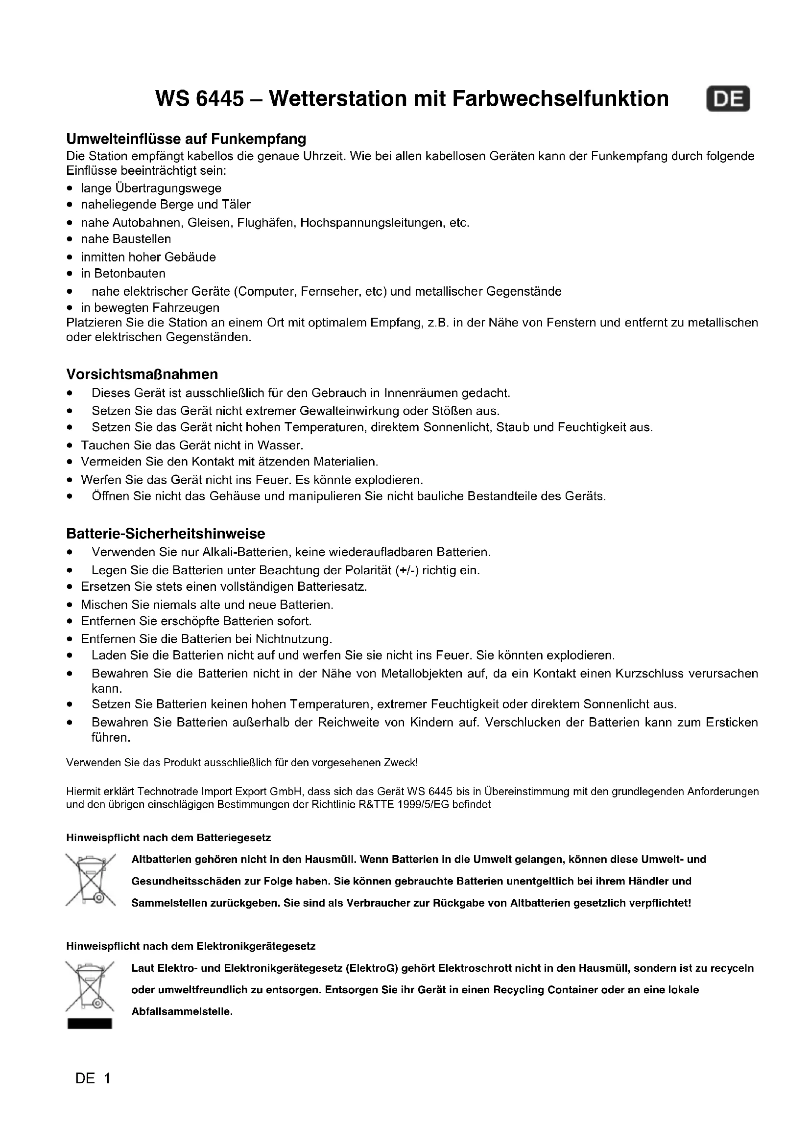 from sources of heat / cold / direct sunlight / rain.FR 1 WS 6445 Station météo avec fonction de changement de couleur Qualité de la réception La station utilise la technologie de transmission sans fil pour récupérer le signal d'horloge et ajuster l'heure en conséquence. Comme avec tout appareil de communication sans fil, la qualité de cette réception se dégrade dans les circonstances suivantes: x longue distance de transmission x Montagnes et vallées proches x près d'une autoroute, d'un chemin de fer, d'un aéroport, d'une ligne à haute tension, etc. x près d'un chantier de construction x au milieu de hauts bâtiments x à l'intérieur d'un bâtiment en béton x à proximité d'un appareil électrique (ordinateur, téléviseur, etc.) et d'une structure métallique x à l'intérieur d'un véhicule en déplacement Placez la station à un endroit adapté pour une bonne réception des signaux radio, en l'occurrence près d'une fenêtre et loin de toute surface métallique et de tout appareil électrique. Précautions x Installez l'appareil en intérieur. x N'exposez pas l'appareil à des forces et des chocs excessifs. x N'exposez pas l'appareil à des températures extrêmes, directs du soleil, à la poussière ou à l'humidité. x Ne plongez pas l'appareil dans l'eau. x Évitez tout contact avec des matériaux corrosifs. x Ne jetez pas l'appareil dans le feu, elle risque d'exploser. x N'ouvrez pas le coffret de l'appareil et n'altérez aucun de ses composants. Avertissements de sécurité concernant les piles x Utilisez uniquement des piles alcalines, ne pas des piles rechargeables. x Installez les piles en respectant le sens des polarités (+/-). x Remplacez toujours toutes les piles en même temps. x Ne combinez pas des piles usagées avec des piles neuves. x Retirez immédiatement les piles déchargées de l'appareil. x Retirez les piles lorsque vous n'envisagez pas d'utiliser votre appareil avant longtemps. x N'essayez pas de recharger des piles qui ne sont pas rechargeables et ne jetez aucune pile dans le feu (elle risque d'exploser). x Rangez vos piles de façon à ce qu'aucun objet métallique ne puisse mettre leurs bornes en court-circuit. x Évitez d'exposer les piles à des températures extrêmes, à une humidité extrême et aux rayons directs du soleil. x Conservez vos piles hors de portée des enfants. Elles présentent un risque d'étouffement. Utilisez le produit uniquement pour son usage prévu! Techno Trade Import Export GmbH déclare que l'appareil WS 6445 est conforme aux exigences essentielles et autres réglementations pertinentes de la directive R&TTE 1999/5/EC. Noter l'obligation de la Loi sur la batterie Les piles ne doivent pas être déposées avec vos ordures ménagères. Dans le cas où vous le faites vous risquez de provoquer des dommages importants à votre environnement ou à la santé d'autrui. Vous pouvez rendre les piles usagées à votre commerçant qui vous les a vendues ou d'office à une collecte. Vous en tant qu'utilisateur ou consommateur vous êtes obligés par la loi de retourner les piles usagées! Noter l'obligation de la Loi sur les appareils électriques Ce symbole signifie que les appareils électriques ne doivent pas être jetés aux ordures ménagères à la fin de leur vie utile. Ramenez votre appareil à votre point local de collecte de déchets ou à un centre de recyclage. Ceci s'applique à tous les pays de l'Union européenne et aux autres pays européens disposant d'un système de collecte des déchets sélectif.FR 2 Vue avant