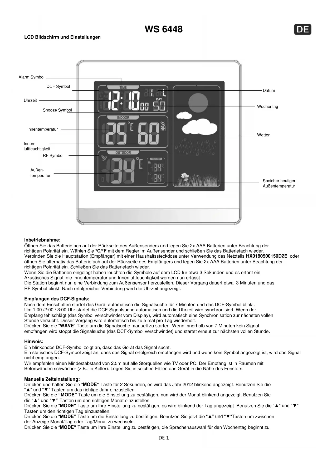 Initial operation: Open the battery compartment on the rear side of the outdoor remote sensor and insert 2x AAA batteries. Pay attention to observe the correct polarity. Select the °C/°F display by pushing the button inside the compartment. Close in the battery compartment. Connect the main station(receiver) with a household power socket by using the power adapter HX0180500150D2E, or alternatively open the battery compartment on the rear side of the receiver and insert 2x AAA batteries. Pay attention to observe the correct polarity. Close the battery compartment. Once the station is powered, the icons on the LCD display will light up for 3 seconds, and you will hear a beep tone, and detect indoor temperature & humidity. The receiver will now start to make a connection to the outdoor remote sensor. This operation takes about 3 minutes and is displayed by a flashing reception antenna symbol in the “OUTDOOR” display area on the receiver. After receiver has created a connection to the outdoor remote sensor, it will then enter the clock mode. Receiving of the DCF signal: After power on, the unit will automatically start to receive DCF signal for 7 minutes, and the reception icon flashes. At 1:00 /2:00 / 3:00 am, DCF reception will be turned on automatically, and the clock will be synchronized if the reception was successfull. If the reception fails (the radio mast icon disappears from the display), the system will automatically attempt another synchronization at the next full hour. This procedure is repeated automatically up to total 5 times per day. Press the “WAVE“ key to start the DCF reception manually. If no signal was received within 7 minutes, then the DCF signal search stops (the radio mast icon disappears) and starts again at the next full hour. Note: A flashing radio mast icon indicates that the unit is searching DCF signal. A continuously displayed radio mast icon indicates that the DCF signal was received successfully, the radio mast icon will disappear if reception fails. We recommend a minimum distance of 2.5 meters to all sources of interference, such as televisions or computer monitors Radio reception is weaker in rooms with concrete walls (e.g.: in cellars). In such extreme circumstances, place the unit close to the window. Manual time setting: Press and hold down the “MODE” button for 2 seconds, the Year display 2012 starts to flash. Now use “▲” and “▼” buttons to set the correct year. Press “MODE” to confirm your setting, the Month display starts to flash. Now use “▲” and “▼” buttons to set the correct month. Press “MODE” to confirm your setting, the Date display starts to flash. Now use “▲” and “▼“buttons to set the correct Weather Outdoor today temperature memory Weekday Date Alarm icon RCC icon Time Snooze icon Indoor temperature Indoor humidity RF icon Outdoor temperatureEN 2 date. Press “MODE” to confirm your setting. Now use “▲” and “▼“buttons to set month/day or day/month. Press “MODE” to confirm your setting, the language selection for the Weekday displays starts to flash. Now use “▲” and “▼“buttons to select a language. There are 7 languages of Weekday: English, German ,Italian, French, Spanish, Dutch and Danish Press “MODE” to confirm your setting, the Time zones start to flash, Now use” ▲” and “▼” buttons to set a correct time zone (-12 to +12). (Germany 0 / UK -1) Press “MODE” to confirm your setting, the 12/24 hour mode display starts to flash. Now use “▲” and “▼ “buttons to set The correct 12/24 hour mode. Press “MODE” to confirm your setting, the Hour display starts to flash. Now use “▲” and “▼“buttons to set the correct hour. Press “MODE” to confirm your setting, the Minute displays starts to flash. Now use “▲” and “▼“buttons to set the correct minute. Press “MODE” to confirm your setting and to end the setting procedures, enter the clock mode. Note: After 7 seconds without pressing any button, the clock switches automatically from set mode to normal time mode. Setting the daily alarms: Press and hold down the ALARM button for 2 seconds until the Hour display of the alarm time starts to flash. Use the “▲” and “▼“buttons to set the required hour. Press ALARM button to confirm your setting The minute display of the alarm time starts to flash. Use the “▲” and “▼“buttons to set the required minute. ALARM button to confirm your setting and to end the setting procedure. To activate or deactivate the daily alarms, press the “ALARM” button once. The alarm is activated when the bell symbol is displayed. Note: After 7 seconds without pressing any button the clock switches automatically from setting mode to normal clock mode. The alarm will sound for 1 minute if you do not deactivate it by pressing any button. In this case the alarm will be repeated automatically after 24 hours. Rising alarm sound (crescendo, duration: 1 minutes) changes the volume 4 times whilst the alarm signal is heard. Automatic SNOOZE function: To activate the automatic snooze function: While the alarm is sounding, press the “SNOOZE/LIGHT” button to activate the snooze function. When the snooze function is activated, the “Zz” symbol appears in the display. The alarm will sound again 5 minutes later. °C/°F temperature display: The temperature is displayed either in °C or °F. Press the“▼“button to switch between °C or °F display. Connection to outdoor sensor: Press and hold down the “▼“ button for 2 seconds to search for outdoor sensors (to erase the current data inside the clock). Backlight: Press the SNOOZE/LIGHT button to activate the display lighting for 5 seconds, if the indoor station is battery powered. Weather forecast The weather station uses the air pressure data for weather forecast. To forecast the weather, the station has 4 icons: sunny light cloudy cloudy rainy Hereby, Technotr