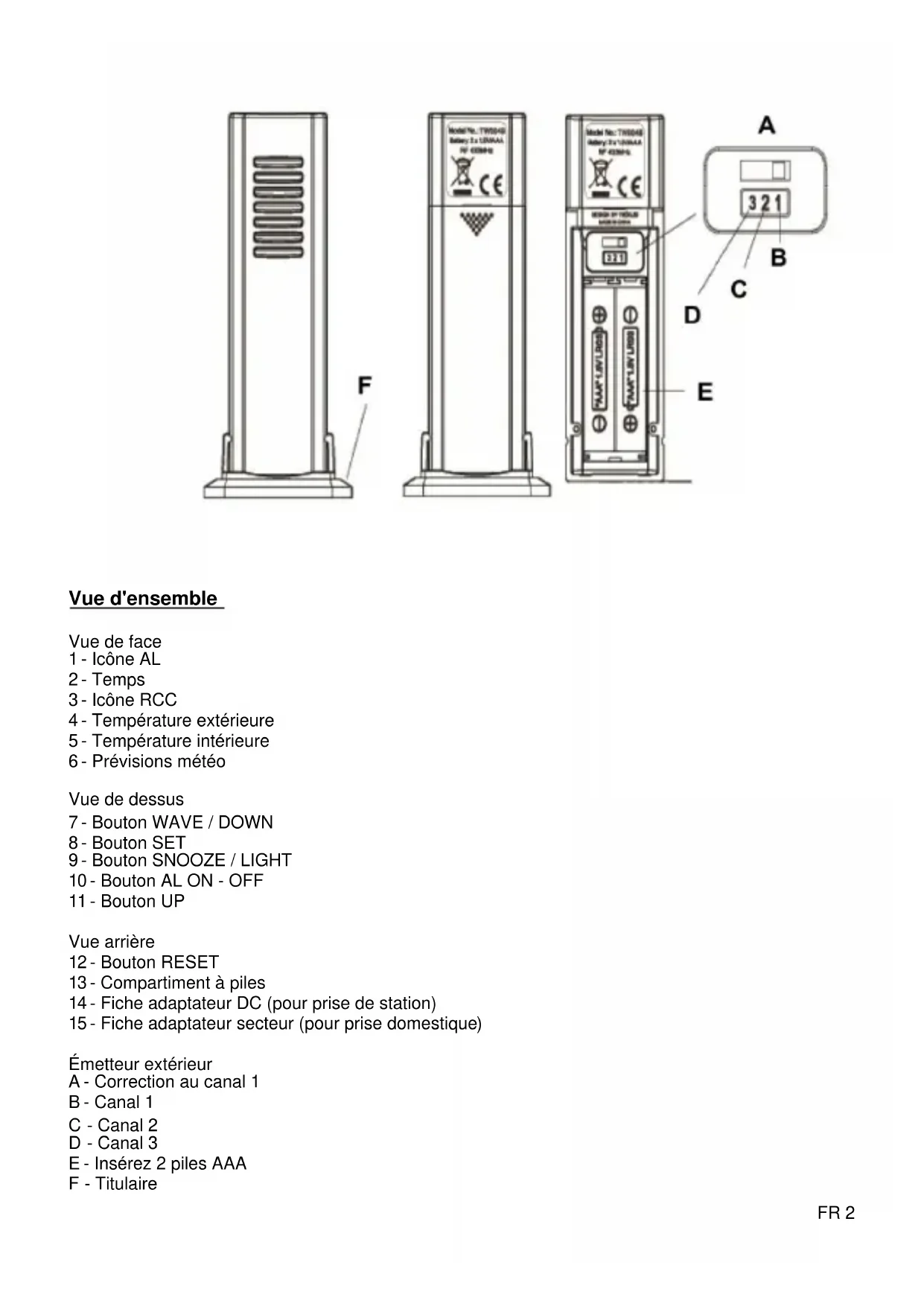 Émetteur extérieur A - Correction au canal 1 B - Canal 1 C - Canal 2 D - Canal 3 E - Insérez 2 piles AAA F - Titulaire
