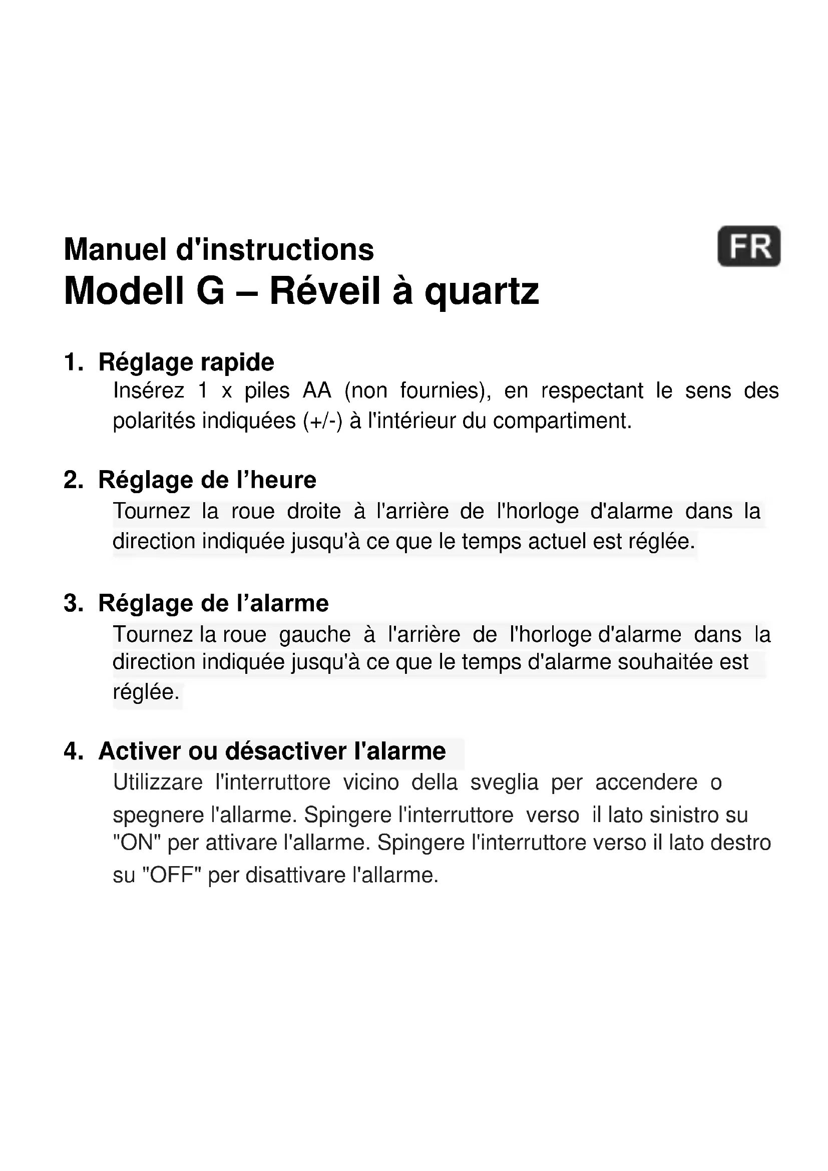 Utilizzare l'interruttore vicino della sveglia per accendere o spegnere l'allarme. Spingere l'interruttore verso il lato sinistro su "ON" per attivare l'allarme. Spingere l'interruttore verso il lato destro su "OFF" per disattivare l'allarme.5. Eclairage & alarme répétitive Appuyez sur le bouton d'éclairage sur le haut de l'horloge d'alarme pour mettre l'éclairage cadran. Appuyez sur le bouton pendant l'alarme pour activer la répétition de l'alarme. L'alarme sonne à nouveau après environ 4 minutes. Si votre réveil à quartz montre de plus grandes déviations ou un changement de sonnerie d'alarme, insérez des piles neuves. Précautions Installez l'appareil en intérieur. N'exposez pas l'appareil à des forces et des chocs excessifs. N'exposez pas l'appareil à des températures extrêmes, directs du soleil, à la poussière ou à l'humidité. Ne plongez pas l'appareil dans l'eau. Évitez tout contact avec des matériaux corrosifs. Ne jetez pas l'appareil dans le feu, elle risque d'exploser. N'ouvrez pas le coffret de l'appareil et n'altérez aucun de ses composants. Avertissements de sécurité concernant les piles Lisez attentivement toutes les instructions avant la première utilisation. Utilisez uniquement des piles alcalines, ne pas des piles rechargeables. Installez les piles en respectant le sens des polarités (+/-). Retirez immédiatement les piles déchargées de l'appareil. Retirez les piles lorsque vous n'envisagez pas d'utiliser votre appareil avant longtemps. N'essayez pas de recharger des piles qui ne sont pas rechargeables et ne jetez aucune pile dans le feu (elle risque d'exploser). Rangez vos piles de façon à ce qu'aucun objet métallique ne puisse mettre leurs bornes en court-circuit. Évitez d'exposer les piles à des températures extrêmes, à une humidité extrême et aux rayons directs du soleil. Conservez vos piles hors de portée des enfants. Elles présentent un risque d'étouffement. Utilisez le produit uniquement pour son usage prévu! Noter l'obligation de la Loi sur la batterie Les piles ne doivent pas être déposées avec vos ordures ménagères. Dans le cas où vous le faites vous risquez de provoquer des dommages importants à votreenvironnement ou à la santé d'autrui. Vous pouvez rendre les piles usagées à votre commerçant qui vous les a vendues ou d'office à une collecte. Vous en tant qu'utilisateur ou consommateur vous êtes obligés par la loi de retourner les piles usagées! Noter l'obligation de la Loi sur les appareils électriques Ce symbole signifie que les appareils électriques ne doivent pas être jetés aux ordures ménagères à la fin de leur vie utile. Ramenez votre appareil à votre point local de collecte de déchets ou à un centre de recyclage. Ceci s'applique à tous les pays de l'Union européenne et aux autres pays européens disposant d'un système de collecte des déchets sélectif.Manual de instrucciones Modell G - Reloj de cuarzo