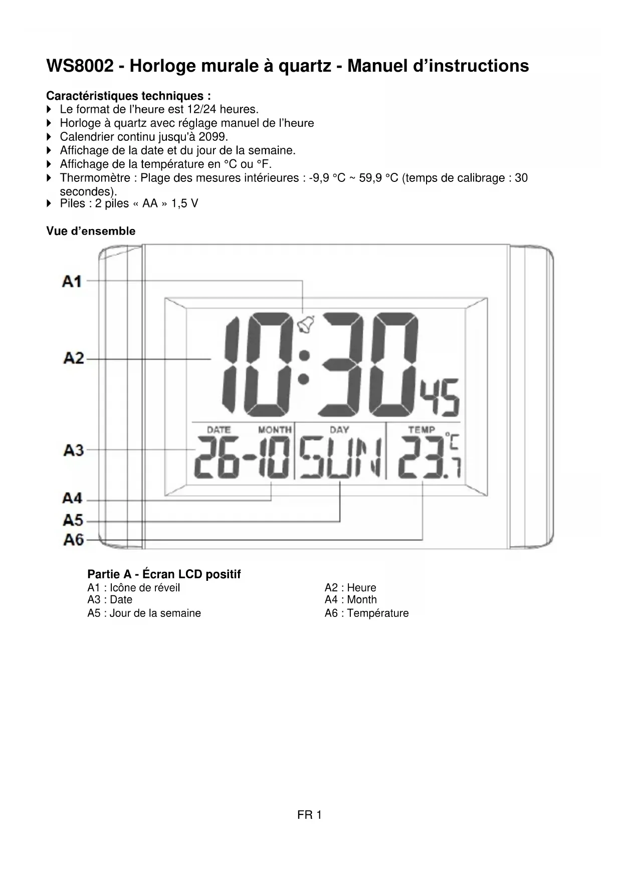 Partie A - Écran LCD positif A1 : Icône de réveil A2 : Heure A3 : Date A4 : Month A5 : Jour de la semaine A6 : TempératureFR 2