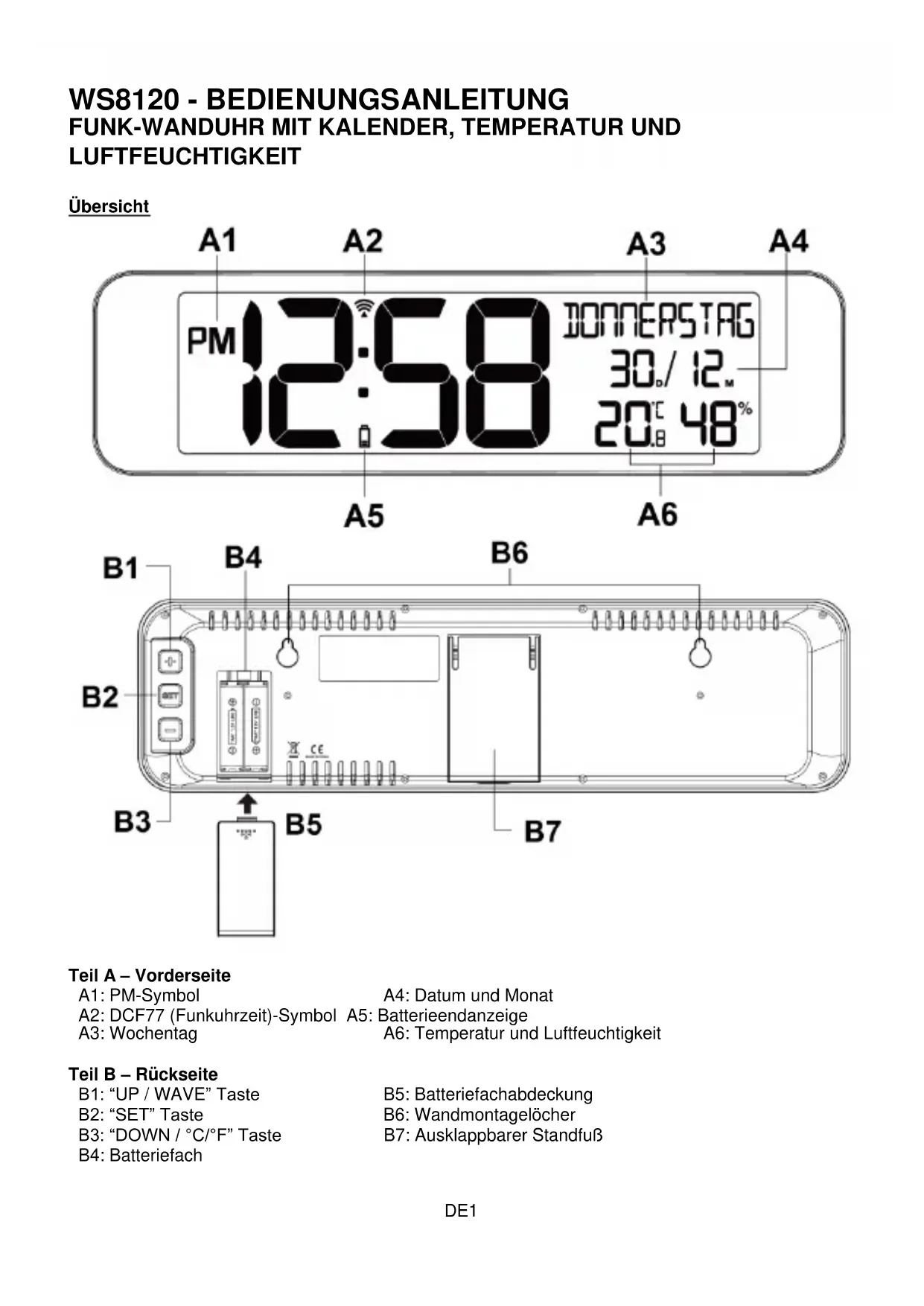 Partie B – Face arrière B1 : Touche « UP/WAVE » B5 : Couvercle du compartiment à piles B2 : Touche « SET » B6 : Trous de montage mural B3 : Touche « DOWN/°C/°F » B7 : Support pliable B4 : Compartiment à pilesFR2 INSTALLATION Retirez le film de protection situé à l’avant de l’horloge. Placez votre horloge face vers le bas sur une surface plane et lisse. Faites glisser et retirez le couvercle du compartiment à piles situé à l’arrière de l’appareil. Insérez 2 piles AA neuves dans le compartiment à piles en respectant les polarités « + » et « -
