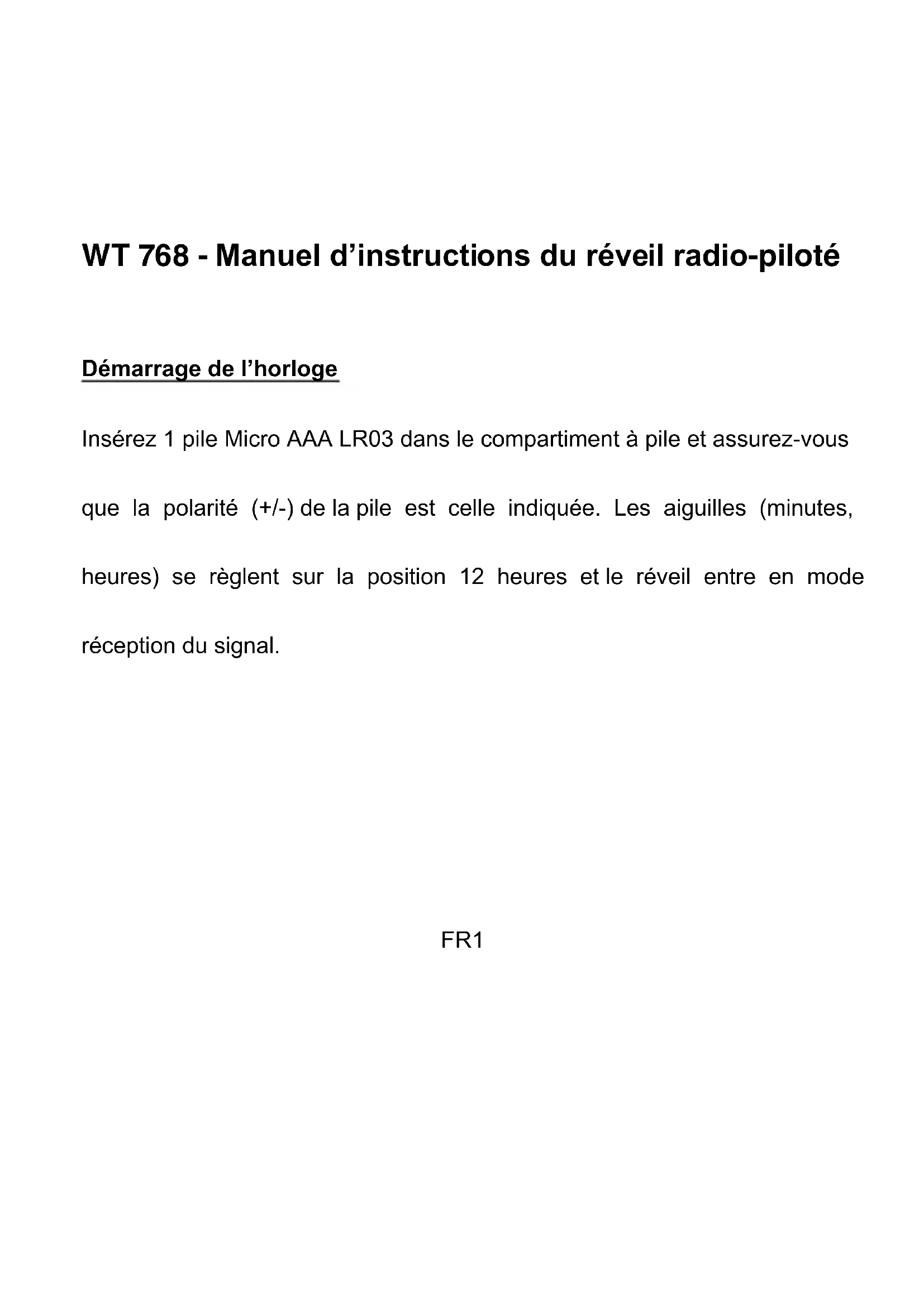 Batterie-Sicherheitshinweise x Verwenden Sie nur Alkali-Batterien, keine wiederaufladbaren Batterien. x Legen Sie die Batterien unter Beachtung der Polarität (+/-) richtig ein. x Ersetzen Sie stets einen vollständigen Batteriesatz. x Mischen Sie niemals alte und neue Batterien. x Entfernen Sie erschöpfte Batterien sofort. x Entfernen Sie die Batterien bei Nichtnutzung. x Laden Sie die Batterien nicht auf und werfen Sie sie nicht ins Feuer. Sie könnten explodieren. x Bewahren Sie die Batterien nicht in der Nähe von Metallobjekten auf,DE11 da ein Kontakt einen Kurzschluss verursachen kann. x Setzen Sie Batterien keinen hohen Temperaturen, extremer Feuchtigkeit oder direktem Sonnenlicht aus. x Bewahren Sie Batterien außerhalb der Reichweite von Kindern auf. Verschlucken der Batterien kann zum Ersticken führen. Verwenden Sie das Produkt ausschließlich für den vorgesehenen Zweck! Hinweispflicht nach dem Batteriegesetz Altbatterien gehören nicht in den Hausmüll. Wenn Batterien in die Umwelt gelangen, können diese Umwelt- und Gesundheitsschäden zur Folge haben. Sie können gebrauchte Batterien unentgeltlich bei ihrem Händler und Sammelstellen zurückgeben. Sie sind als Verbraucher zur RückgabeDE12 von Altbatterien gesetzlich verpflichtet! Hinweispflicht nach dem Elektronikgerätegesetz Laut Elektro- und Elektronikgerätegesetz (ElektroG) gehört Elektroschrott nicht in den Hausmüll, sondern ist zu recyceln oder umweltfreundlich zu entsorgen. Entsorgen Sie ihr Gerät in einen Recycling Container oder an eine lokale Abfallsammelstelle.EN1 WT 768 - Radio controlled alarm clock instruction manual Start the clock Insert 1 x Micro AAA LR03 battery into the battery compartment and make sure the battery polarity (+/-) is as indicated. The hands (minute, hour) are adjusting to 12 o’clock position and the alarm clock enters into signal reception mode.EN2 Signal reception mode The time base for the radio controlled time is a Cesium Atomic Clock operated by the Physikalisch Technische Bundesanstalt Braunschweig which has a time deviation of less than one second in one million years. The time is coded and transmitted from Mainflingen near Frankfurt via frequency signal DCF-77 (77.5 kHz) and has a transmitting range of approximately 1,500 km. The radio controlled alarm clock receives this signal and converts it to show the precise time in summer or wintertime.EN3 Environmental reception effects The clock obtains the accurate time with wireless technology. Same as all wireless devices, the reception is maybe affected by the following circumstances: x long transmitting distance x nearby mountains and valleys x near freeway, railway, airports, high voltage cable etc. x near construction site x among tall buildings x inside concrete buildingsEN4 x near electrical appliances (computers, TV’s, etc) and metallic structures x inside moving vehicles Place the clock at a location with optimal signal, i.e. close to a window and away from metal surfaces or electrical appliances. a. Automatic signal reception: The automatic signal reception starts by inserting the battery. After 2 to 5 minutes the hands will be adjusted to the correct radio controlled time according to the DCF-77 reception signal. Then, t he time will calibrate severalEN5 times a day with the DCF-77 signal reception signal (also independent setting of summer- and winter time). b. Manual signal reception: Press and hold the REC button longer than 3 seconds to start the manual signal reception. The hands (minute, hour) are adjusting to 12 o’clock position and the clock enters into signal reception mode. If the signal is successfully received, the hands adjust automatically to the correct radio controlled time. This procedure takes approximately 2 to 5 minutes. If the signal reception is failed, the alarm clock takes the previously set time again . After the next successful signalEN6 reception the time will be adjusted to the correct radio controlled time according to the DCF-77 reception signal. Note: The DCF-77 reception is only available in Europe. Manual time setting Press and hold the M.SET button until the desired time is set. Alarm time setting Turn the alarm set knob in indicated direction until the desired alarm time is set.EN7 Turn on/ off the alarm Turn the ON/OFF switch to the ON position, the alarm will ring with a beep alarm when the set alarm time is reached. Turn it to the OFF position, the alarm will not ring. Note: If the alarm is not interrupted or turned off, it stops automatically after 2 minutes and rings again after 12 hours. Snooze alarm & light Press the SNOOZE/LIGHT button (at the top of the case) to activate the snooze alarm after 5 minutes and turn on the light.EN8 Reset If the clock shows an incorrect time or after changing the battery, press the RESET button on the case back panel to re-start the alarm clock. The hands (minute, hour) are adjusting again to 12 o’clock position and the clock enters into signal reception mode. In successful signal reception the time will be adjusted to the correct radio controlled time according to the DCF-77 reception signal. Precautions x This main unit is intended to be used only indoors. x Do not subject the unit to excessive force or shock.EN9 x Do not expose the unit to extreme temperatures, direct sunlight, dust or humidity. x Do not immerse in water. x Avoid contact with any corrosive materials. x Do not dispose this unit in a fire as it may explode. x Do not open the inner back case or tamper with any components of this unit. Batteries safety warnings x Use only alkaline batteries, not rechargeable batteries. x Install batteries correctly by matching the polarities (+/-). x Always replace a complete set of batteries. x Never mix used and new batteries. x Remove exhausted batteries immediately. x Remove batteries when not in use.EN10 x Do not recharge and do not dispose of batteries in fire as the batteries may explode. x Ensure batteries are stored away from metal 