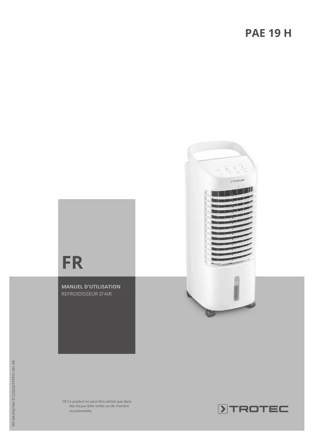 - MANUEL D'UTILISATION REFROIDISSEUR D'AIR FR Ce produit ne peut être utilisé que dans des locaux bien isolés ou de manière occasionnelle.2 FR refroidisseur d'air PAE 19 H Sommaire Indications sur le manuel d'utilisation p. 2