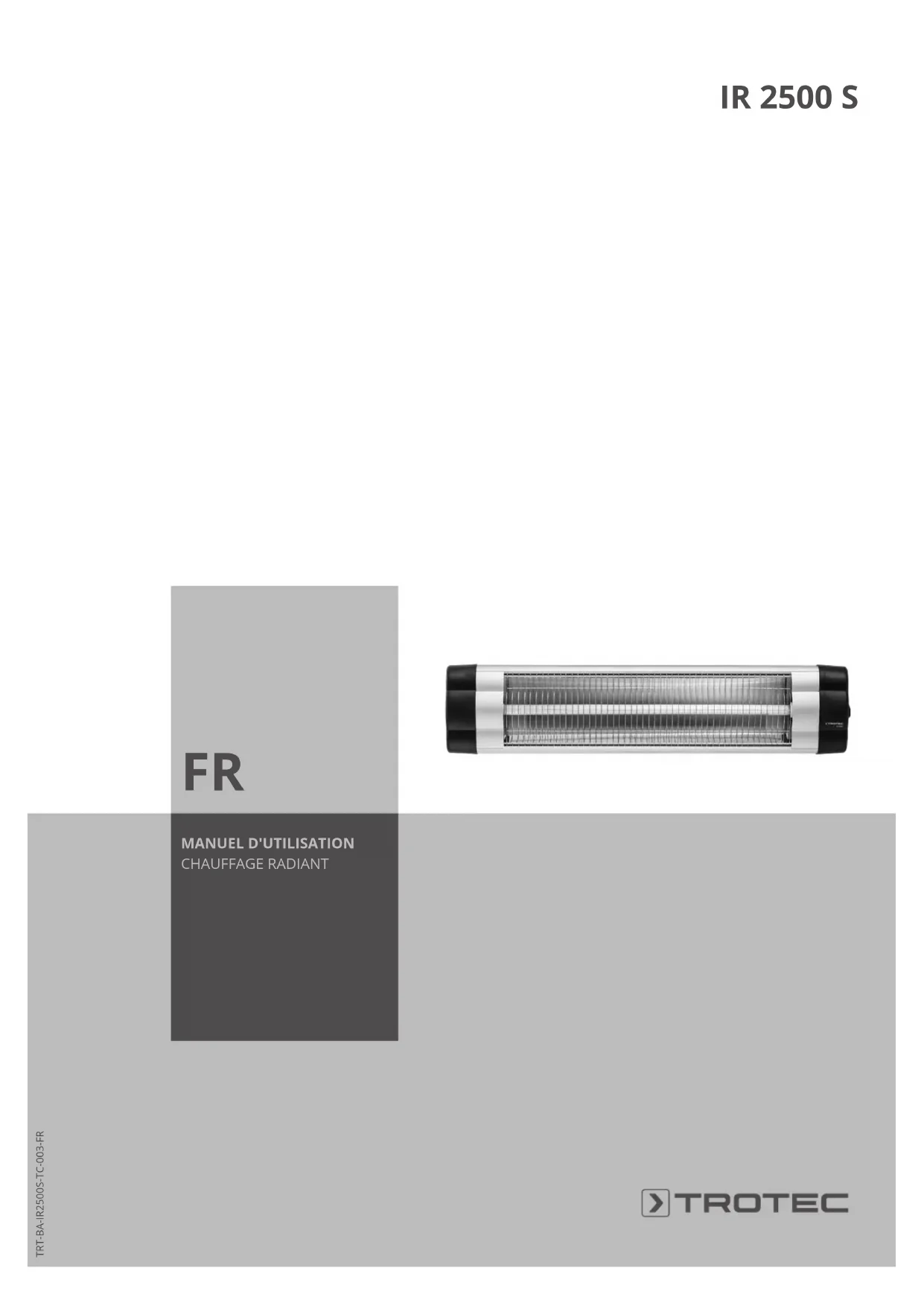 - Élimination des déchets Indications sur le manuel d'utilisation Symboles Avertissement relatif à la tension électrique Ce symbole indique que la tension électrique cause des risques pour la vie et la santé des personnes. Avertissement de surface chaude Ce symbole indique que les surfaces brûlantes causent des risques pour la vie et la santé des personnes. Avertissement Cette mention d’avertissement indique un risque moyen qui peut entraîner des blessures graves ou mortelles s’il n’est pas évité. Attention Cette mention d’avertissement indique un risque faible qui peut entraîner des blessures bénignes ou moyennes s’il n’est pas évité. Remarque Cette mention d’avertissement indique des informations importantes (par ex. dommages matériels), mais aucun danger. Info Les indications présentant ce symbole vous aident à exécuter vos tâches rapidement et en toute sécurité. Observer le mode d’emploi Les indications présentant ce symbole vous indiquent qu’il est nécessaire de respecter le manuel d'utilisation. Vous pouvez télécharger la dernière version du manuel d'utilisation et la déclaration de conformité UE sous le lien suivant: IR 2500 S https://hub.trotec.com/?id=40762 Normes de sécurité Veuillez lire attentivement le présent manuel avant la mise en service ou l'utilisation de l'appareil et conservez-le à proximité immédiate de l'endroit d'installation ou de l'appareil même! Avertissement Lire toutes les consignes de sécurité et toutes les instructions. Le non-respect des consignes de sécurité risque de causer une électrocution, de provoquer un incendie et/ ou de causer des blessures graves. Conservez toutes les consignes de sécurité et toutes les instructions pour pouvoir vous y reporter ultérieurement. Les enfants de plus de 8 ans et toute personne ayant des capacités physiques, sensorielles ou mentales réduites ou ne possédant pas l'expérience et/ou les connaissances nécessaires peuvent utiliser l'appareil pour autant qu'ils bénéficient d'une supervision ou ont reçu une instruction adéquate relative à une utilisation sure de l'appareil et qu'ils ont compris les dangers liés à cette utilisation. Les enfants ne sont pas autorisés à jouer avec l'appareil. Il est interdit aux enfants d'effectuer le nettoyage et l'entretien de l’appareil sans surveillance.FR 2 Manuel d'utilisation – chauffage radiant IR 2500 S Avertissement Garder à distance les enfants de moins de 3 ans, sauf s’ils sont l’objet d’une surveillance constante. Les enfants âgés de 3 à 8 ans n’ont le droit d’allumer et d’éteindre l’appareil que s’ils font l’objet d’une surveillance ou s’ils ont reçu une instruction adéquate relative à une utilisation sure de l'appareil et qu'ils ont compris les dangers liés à cette utilisation, à condition que l’appareil soit placé ou installé dans sa position normale d’utilisation. Les enfants âgés de 3 à 8 ans n’ont pas le droit de brancher la fiche secteur dans la prise, de réguler l’appareil, de le nettoyer ni d’effectuer l’entretien utilisateur. Avertissement N’utilisez pas l’appareil dans des pièces de taille réduite s’il s’y trouve des personnes incapables de quitter la pièce de manière autonome et qu’elles ne sont pas sous surveillance permanente. p. 9