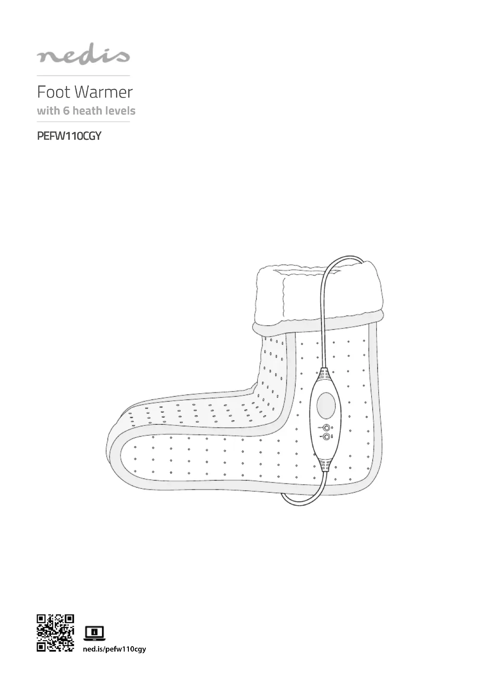 Guide de démarrage rapide Chaue-pieds PEFW110CGYPour plus d'informations, consultez le manuel détaillé en ligne : ned.is/pefw110cgy Utilisation prévue Le PEFW110CGY Nedis est un chaue-pieds avec un contrôleur amovible qui comprend une minuterie, 6 niveaux de chaleur et un achage LED.Le produit ore une protection contre la surchaue et la doublure amovible en laine synthétique est lavable en machine.Le produit est prévu pour un usage intérieur uniquement.Ce produit peut être utilisé par des enfants âgés de 8 ans et plus ainsi que des personnes ayant des capacités physiques, sensorielles ou mentales réduites ou manquant d’expérience et de connaissances s’ils sont supervisés ou ont reçu des instructions sur l’utilisation du produit en toute sécurité et comprennent les dangers impliqués. Les enfants ne doivent pas jouer avec le produit. Le nettoyage et la maintenance ne doivent pas être eectués par des enfants sans surveillance.Ce produit n'est pas destiné aux personnes insensibles à la chaleur et aux autres personnes vulnérables, comme des enfants de moins de 3 ans, qui ne peuvent pas réagir à une surchaue.Le produit n’est pas destiné à un usage professionnel.Le produit n’est pas destiné à un usage médical dans des hôpitaux.Ce produit n’est pas destiné à réchauer des animaux.Toute modication du produit peut avoir des conséquences sur la sécurité, la garantie et le bon fonctionnement. Pièces principales (image A) 1 Doublure amovible en laine synthétique2 Achage LED3 Bouton Marche/Arrêt4 Bouton Temperature5 Câble d'alimentation Consignes de sécurité
