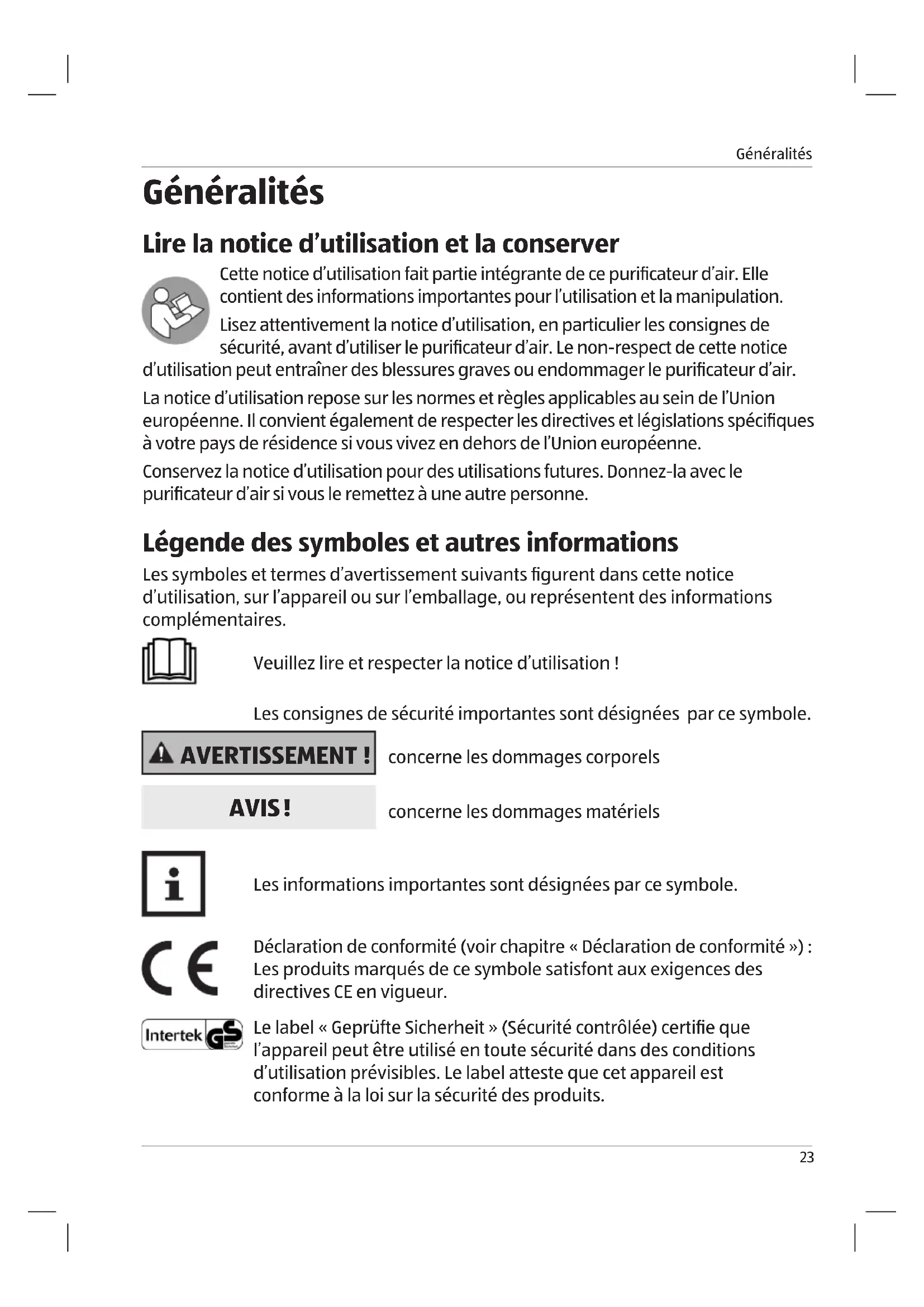 - Lire la notice d’utilisation et la conserver p. 23