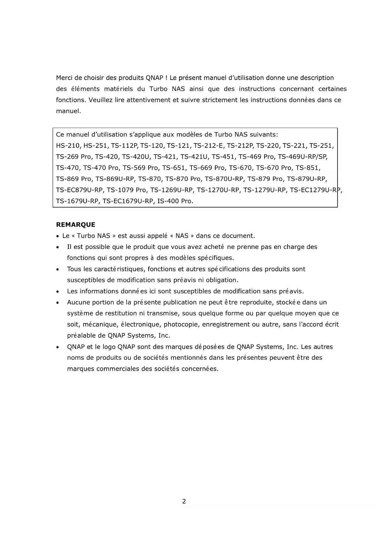 Turbo NAS QNAP Manuel d’utilisation du matériel © 2014. QNAP Systems, Inc. All Rights Reserved.2 Merci de choisir des produits QNAP ! Le présent manuel d‟utilisation donne une description des éléments matériels du Turbo NAS ainsi que des instructions concernant certaines fonctions. Veuillez lire attentivement et suivre strictement les instructions données dans ce manuel. Ce manuel d‟utilisation s‟applique aux modèles de Turbo NAS suivants: HS-210, HS-251, TS-112P, TS-120, TS-121, TS-212-E, TS-212P, TS-220, TS-221, TS-251, TS-269 Pro, TS-420, TS-420U, TS-421, TS-421U, TS-451, TS-469 Pro, TS-469U-RP/SP, TS-470, TS-470 Pro, TS-569 Pro, TS-651, TS-669 Pro, TS-670, TS-670 Pro, TS-851, TS-869 Pro, TS-869U-RP, TS-870, TS-870 Pro, TS-870U-RP, TS-879 Pro, TS-879U-RP, TS-EC879U-RP, TS-1079 Pro, TS-1269U-RP, TS-1270U-RP, TS-1279U-RP, TS-EC1279U-RP, TS-1679U-RP, TS-EC1679U-RP, IS-400 Pro. REMARQUE Le « Turbo NAS » est aussi appelé « NAS » dans ce document. Il est possible que le produit que vous avez acheté ne prenne pas en charge des fonctions qui sont propres à des modèles spécifiques. Tous les caractéristiques, fonctions et autres spécifications des produits sont susceptibles de modification sans préavis ni obligation. Les informations données ici sont susceptibles de modification sans préavis. Aucune portion de la présente publication ne peut être reproduite, stockée dans un système de restitution ni transmise, sous quelque forme ou par quelque moyen que ce soit, mécanique, électronique, photocopie, enregistrement ou autre, sans l‟accord écrit préalable de QNAP Systems, Inc. QNAP et le logo QNAP sont des marques déposées de QNAP Systems, Inc. Les autres noms de produits ou de sociétés mentionnés dans les présentes peuvent être des marques commerciales des sociétés concernées.3
