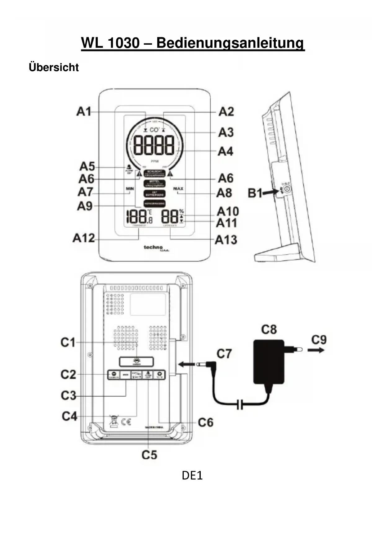 Déclaration de conformité Par la présente, Technotrade déclare que ce produit WL 1030 est conforme aux exigences essentielles et autres dispositions pertinentes de la directive 2014/53/UE et ROHS 2011/65/CE. La déclaration de conformité EU originale est disponible à l’adresse : www.technoline.de/doc/4029665610306 Spécifications CO2 Plage de mesure : 400 – 5000 ppm Résolution : 1 ppm Précision : +/-5 % +50 ppm Temps de préchauffage 1 minute Plage de température : 0 °C à 50 °C/32 °F à 122 °F Résolution de température : 0,1 °C/0,2 °F Plage d'humidité relative : 20% à 95% Précision d’humidité relative : 1 % Température de 0 °C à 50 °C/32 °F à 122 °F,FR10 fonctionnement : < 95 %, sans condensation