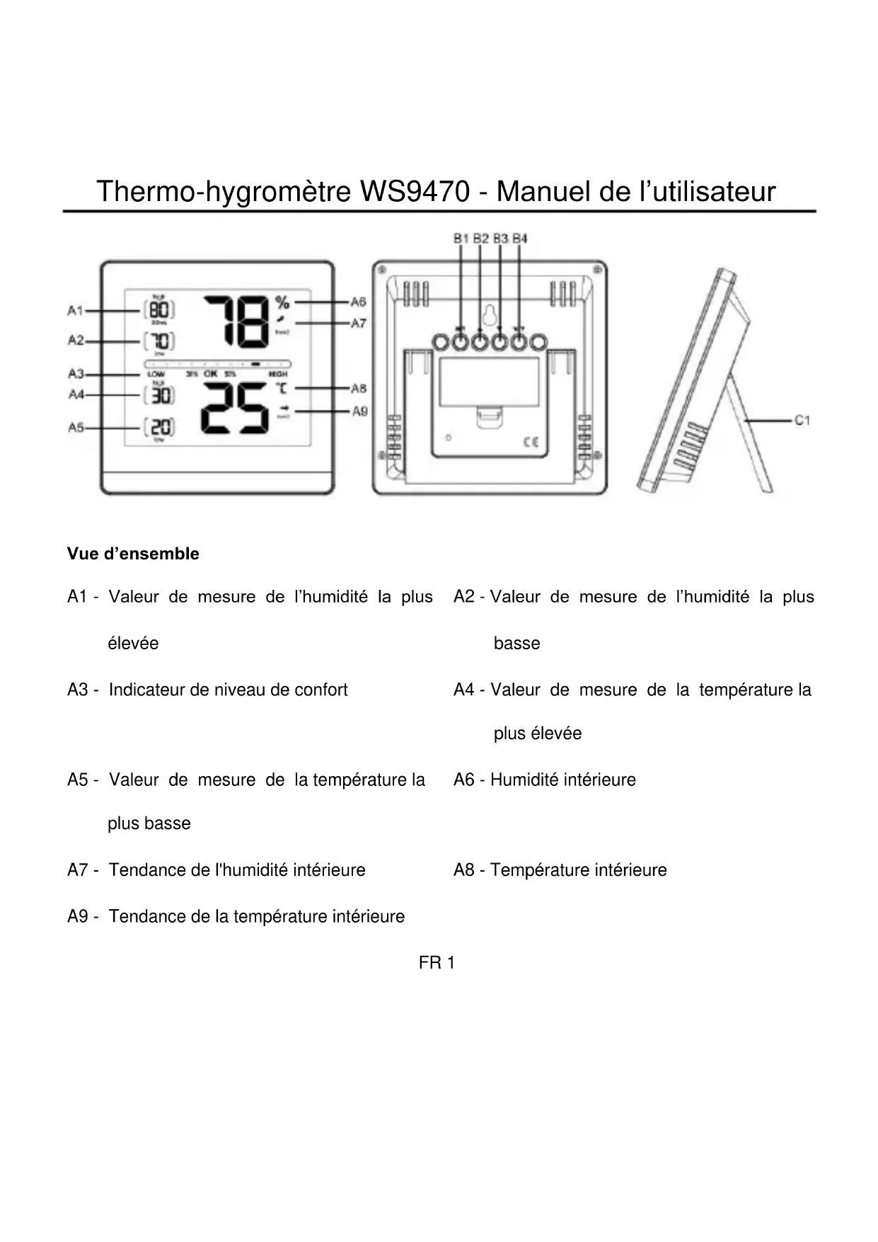Mise en route Ouvrez le compartiment à pile. Insérez 2 piles AAA de 1,5 V, en respectant les polarités +/- indiquées dans le compartiment à pile. La température et l’humidité mesurées apparaîtront à l’écran. Refermez le compartiment à pile. Affichage des températures Appuyez sur la touche °C/°F pour choisir entre °C (Celsius) et °F (Fahrenheit) comme unité de température. Indicateur de tendance Les flèches de tendance indiquent si les valeurs de température et d’humidité sont actuellement en augmentation (flèche vers le haut), stables (flèche vers le côté) ou en baisse (flèche vers le bas).FR 3 Niveau de confort Un symbole apparaît à l’écran pour indiquer le niveau de confort : Un symbole près de LOW signifie que l’environnement est trop sec. Un symbole près de OK signifie que l’environnement est confortable. Un symbole près de HIGH signifie que l’environnement est trop humide. Valeurs maximales et minimales Il existe deux modes de mémoire pour les valeurs maximale et minimale affichées de high et low pour la température et l’humidité. Appuyez sur la touche ▲ ou ▼ en mode normal pour voir le mode d’affichage 24hrs ou all-time des valeurs maximum-minimum. Mode All-time : Dès que la station est active, les valeurs maximales et minimales sont mémorisées. Mode 24hrs : Les valeurs maximales et minimales seront réinitialisées toutes les 24 heures (à partir du moment de l’activation).FR 4 Réinitialisation manuelle Appuyez sur la touche ▲ et maintenez-la enfoncée dans le mode d’affichage correspondant pour effacer la valeur élevée enregistrée. Appuyez sur la touche ▼ et maintenez-la enfoncée dans le mode d’affichage correspondant pour effacer la valeur basse enregistrée. Fonction de calibration Le thermo-hygromètre permet à l’utilisateur de calibrer l’affichage des mesures de la température et de l’humidité avec une meilleure source de référence externe. L’utilisateur peut ajuster les affichages de la température et de l’humidité dans la plage de mesure. Lors du remplacement des piles, les valeurs calibrées sont automatiquement supprimées.FR 5 Calibrage de l’affichage de l’humidité et de la température Appuyez sur la touche SET et maintenez-la enfoncée pendant 3 secondes, l’humidité clignote. Appuyez sur la touche ▲ ou ▼ pour corriger l’affichage de l’humidité. CALIBRATED apparaît à l’écran, sous l’humidité. Appuyez brièvement sur la touche SET pour confirmer les modifications, la température clignote. Appuyez sur la touche ▲ ou ▼pour corriger l’affichage de la température. CALIBRATED apparaît en dessous de la température sur l’écran. Appuyez brièvement sur la touche SET pour confirmer les modifications et quitter le mode de réglage. Remarque : CALIBRATED restera affiché à l’écran aussi longtemps que les valeurs resteront calibrées. Icône piles faibles Changez les piles dès que le symbole de la pile apparaît à l’écran.FR 6 Précautions Cet appareil est destiné à être utilisé uniquement à l’intérieur. Ne soumettez pas l’appareil à une force ou à un choc excessif. N’exposez pas l’appareil à la lumière directe du soleil, à des températures extrêmes, à l’humidité ou à la poussière. Ne plongez pas l’appareil dans l’eau. Évitez de le mettre en contact avec des matériaux corrosifs. Ne jetez pas cet appareil au feu, il risque d’exploser. N’ouvrez pas le panneau arrière et n’apportez aucune modification aux composants de cette unité. Avertissements de sécurité concernant les piles Utilisez uniquement des piles alcalines non rechargeables. Installez les piles en respectant les polarités (+/-). Remplacez toujours toutes les piles en même temps. Ne mélangez pas des piles usagées avec des piles neuves. Lorsque les piles sont déchargées, les retirer immédiatement de l’appareil.FR 7 Retirez les piles lorsque vous n’allez pas utiliser l’appareil. N’essayez pas de recharger des piles qui ne sont pas rechargeables et ne jetez aucune pile au feu, elle risque d’exploser. Rangez vos piles de façon à ce qu’aucun objet métallique ne puisse causer de court-circuit. Évitez d’exposer les piles à des températures extrêmes, à l’humidité ou à la lumière directe du soleil. Conservez vos piles hors de la portée des enfants. Elles présentent un risque d’étouffement. N’utilisez cet appareil que pour l’usage auquel il est destiné !FR 8 Obligation légale concernant la mise au rebut des piles Les piles usagées ne font pas partie des ordures ménagères car elles pourraient nuire à la santé et à l’environnement. Vous pouvez ramener les piles usagées sans frais à votre revendeur et aux points de collecte. En tant que consommateur, vous êtes obligé par la loi de ramener les piles usagées aux revendeurs et aux points de collecte ! Respect de l’obligation de la loi sur les appareils électriques Ce symbole signifie que vous ne devez pas jeter les appareils électriques en fin de vie avec les autres ordures ménagères. Ramenez votre appareil à un point de collecte de déchets ou à un centre de recyclage local. Ceci s’applique à tous les pays de l’Union européenne et aux autres pays européens disposant d’un système de collecte sélectif des déchets.