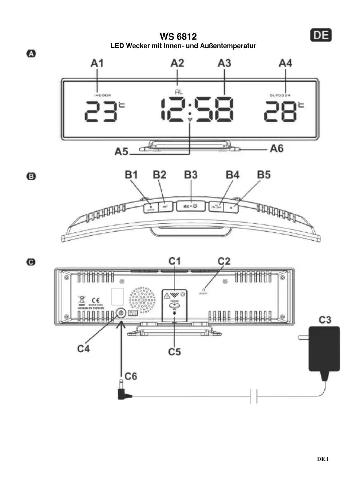 APERÇU A – Vue de face A1 – Température intérieure A4 – Température extérieure A2 – Alarme activée A5 – Indicateur RCC A3 – Temps A6 – Supporter B – Vue de dessus B1 – Touche DOWN / WAVE B4 – Touche ALARM ON / OFF B2 – Touche SET B5 – Touche UP B3 – Touche SNOOZE / DIMMER C – Vue arrière C1 – Couvercle du compartiment de la batterie C4 – Prise de courant continu C2 – Touche RESET C5 – Insérer 1 x pile CR2032 C3 – Adaptateur AC / DC C6 – Insérer la prise de l'adaptateur D – Sonde de température extérieure D1 – Supporter D4 – Canal 2 D2 – Correction au canal 1 D5 – Canal 3 D3 – Canal 1 D6 – Insérer 2 x piles AAA