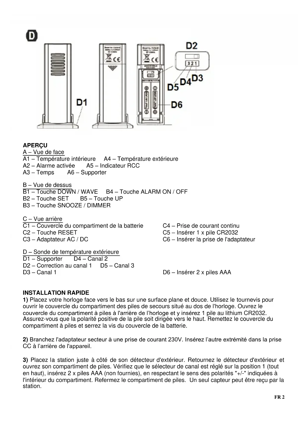 APERÇU A – Vue de face A1 – Température intérieure A4 – Température extérieure A2 – Alarme activée A5 – Indicateur RCC A3 – Temps A6 – Supporter B – Vue de dessus B1 – Touche DOWN / WAVE B4 – Touche ALARM ON / OFF B2 – Touche SET B5 – Touche UP B3 – Touche SNOOZE / DIMMER C – Vue arrière C1 – Couvercle du compartiment de la batterie C4 – Prise de courant continu C2 – Touche RESET C5 – Insérer 1 x pile CR2032 C3 – Adaptateur AC / DC C6 – Insérer la prise de l'adaptateur D – Sonde de température extérieure D1 – Supporter D4 – Canal 2 D2 – Correction au canal 1 D5 – Canal 3 D3 – Canal 1 D6 – Insérer 2 x piles AAA