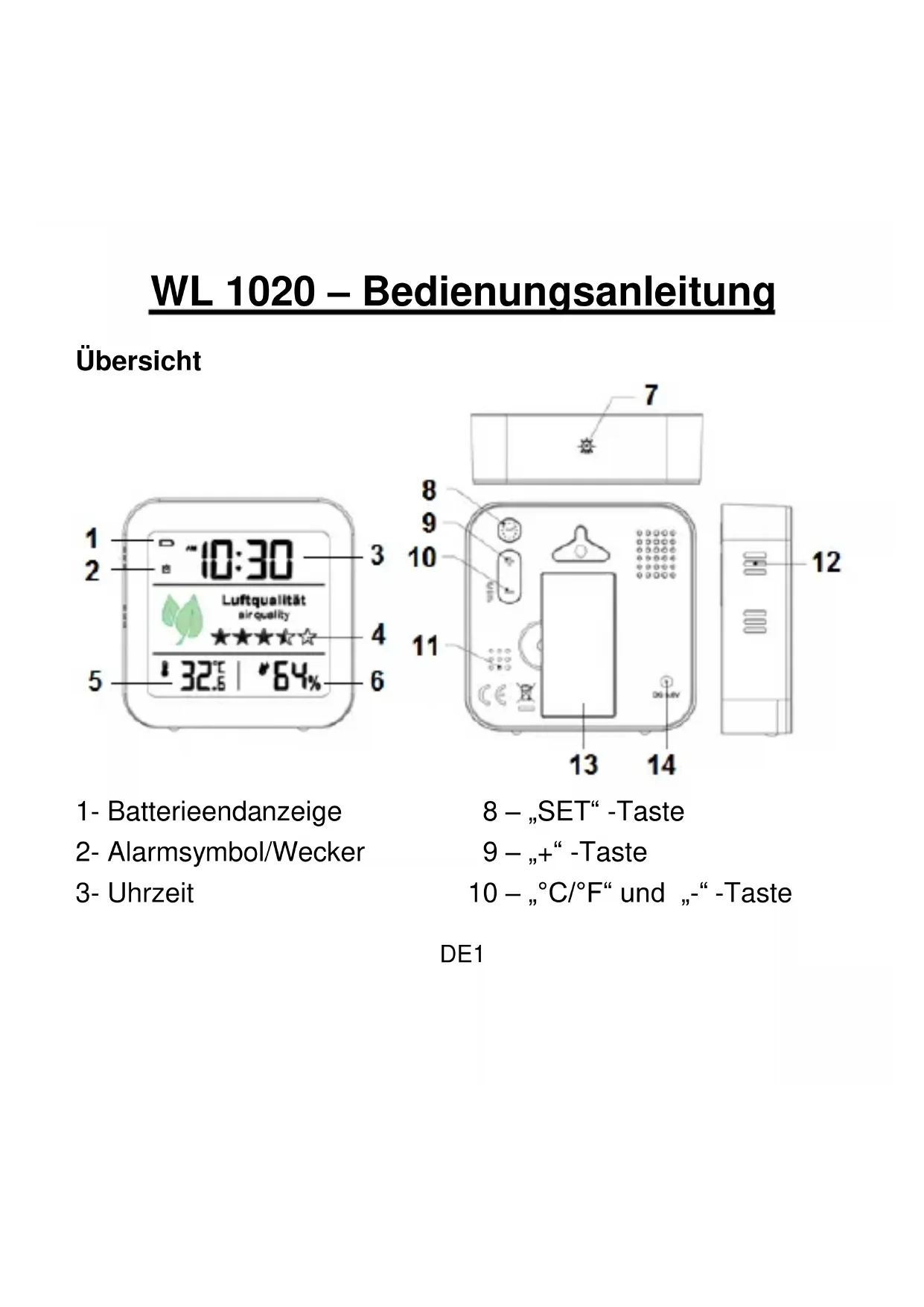 Fonctions principales Horloge à quartz Affichage de l’heure sur le format 12/24 heures Alarme avec fonction de répétition de 5 minutes Affichage de la température et de l’humidité intérieures Mémoire des valeurs MIN/MAX pour la température et l’humidité Affichage de la qualité de l’air sous forme de classementFR3 par 5 étoiles Indicateur de piles faibles Rétroéclairage blanc Passage au jaune : ventilation recommandée Passage au rouge : Le capteur de qualité de l’air (capteur de TVOC) mesure des valeurs très élevées et une ventilation est nécessaire d’urgence Mise en route : Utilisation avec adaptateur USB Utilisez uniquement l’adaptateur USB fourni pour connecter un appareil alimenté au WL 1020. Ou utilisez un adaptateur USB standard de 5,0 V/1 A (non inclus) pour connecter le câble de l’adaptateur USB à une prise de courant domestique.FR4 Utilisation avec piles Retirez le couvercle du compartiment à piles du WL 1020 et insérez 2 piles AAA en respectant la polarité [« + » et « - »]. Remettez le couvercle du compartiment à piles en place. Remarques Le capteur de qualité de l’air sera initialisé pendant environ 15 secondes, puis le classement de cinq étoiles pour la qualité de l’air sera mis à jour. Placez le WL 1020 correctement sur une surface plane avec suffisamment d’espace libre de tous les côtés. En procédant ainsi, le capteur de TVOC et le capteur hygro- thermique du WL 1020 peuvent obtenir les meilleurs résultats.FR5 Réglage de l’heure et de l’heure d’alarme En mode d’affichage normal, appuyez sur le bouton « SET » et maintenez-le enfoncé pendant 3 secondes pour accéder au mode de réglage. Appuyez sur le bouton « + » ou « - » pour effectuer les réglages et sur le bouton « SET » pour confirmer chaque réglage. Appuyez sur le bouton « + » ou « - » et maintenez-le enfoncé pour accélérer le processus et atteindre plus rapidement la valeur souhaitée. La séquence de réglage est affichée comme suit : affichage 12/24 heures -> heure -> minute -> heure de l’alarme -> minute de l’alarme -> quitter Remarque : L’appareil quitte le mode de réglage et revient au mode d’affichage normal après 10 secondes lorsqu’aucun réglage n’est effectué à l’aide de boutons.FR6 Activation/désactivation de l’alarme : Appuyez sur le bouton « SET » pour activer ou désactiver l’alarme. L’icône d’alarme s’affiche aussi longtemps que l’alarme est activée. Fonction d’alarme et de répétition : Lorsque l’alarme sonne, l’icône d’alarme clignote. Appuyez sur le bouton « LICHT » pour activer l’alarme de répétition (l’icône d’alarme clignote en permanence sur l’écran LCD) ou sur tout autre bouton pour la désactiver, elle sonnera à la même heure le jour suivant. Lorsque la fonction de répétition est active, appuyez sur un bouton quelconque, excepté le bouton « LICHT », pour arrêter l’alarme de répétition.FR7 Remarque : L’alarme sonne pendant 2 minutes et augmente en intensité avec le temps avant de s’arrêter automatiquement, si elle n’est pas interrompue en appuyant sur n’importe quel bouton. Température et humidité En mode d’affichage normal, appuyez sur le bouton « °C/°F » pour basculer entre l’affichage de température en °C et en °F. Température et humidité maximales/minimales En mode d’affichage normal, appuyez sur le bouton « + » pour afficher les valeurs maximales et minimales de température et d’humidité. MAX s’affiche lors de la visualisation des valeurs maximales et MIN s’affiche lorsFR8 de la visualisation des valeurs minimales. Informations sur le capteur de TVOC et de CO2 Le TVOC et le CO2 (dioxyde de CARBONE) adoptent des capteurs d’oxyde métallique avec une stabilité à long terme et une faible dérive. TVOC est l’abréviation de composés organiques volatils totaux, contenant des milliers de composés. CO2, le capteur ne détecte pas directement le CO2 dans l’environnement, mais la valeur approximative dérivée d’autres paramètres pertinents du capteur. Test de qualité de l’air Lorsque le WL 1020 est alimenté par un câble USB : Le capteur de la qualité de l’air (TVOC) est activé en permanence.FR9 Lorsque le WL 1020 est alimenté par des piles : Appuyez sur le bouton « LICHT » et maintenez-le enfoncé pendant 3 secondes pour activer le capteur. Cela permet de mettre à jour et d’afficher le classement de cinq étoiles pour la qualité de l’air dans un délai de 15 secondes. Le mode de test du capteur est désactivé au bout de 5 minutes afin d’économiser l’énergie et d’éviter que les piles ne se déchargent trop rapidement. L’affichage conservera l’état de la dernière mesure affichée à l’écran Affichage de la qualité de l’air La qualité de l’air est affichée par 5 symboles étoile, qui changent en fonction de la valeur mesurée du CO2 :FR10 Symboles affichés Plage de valeurs Qualité de l’air