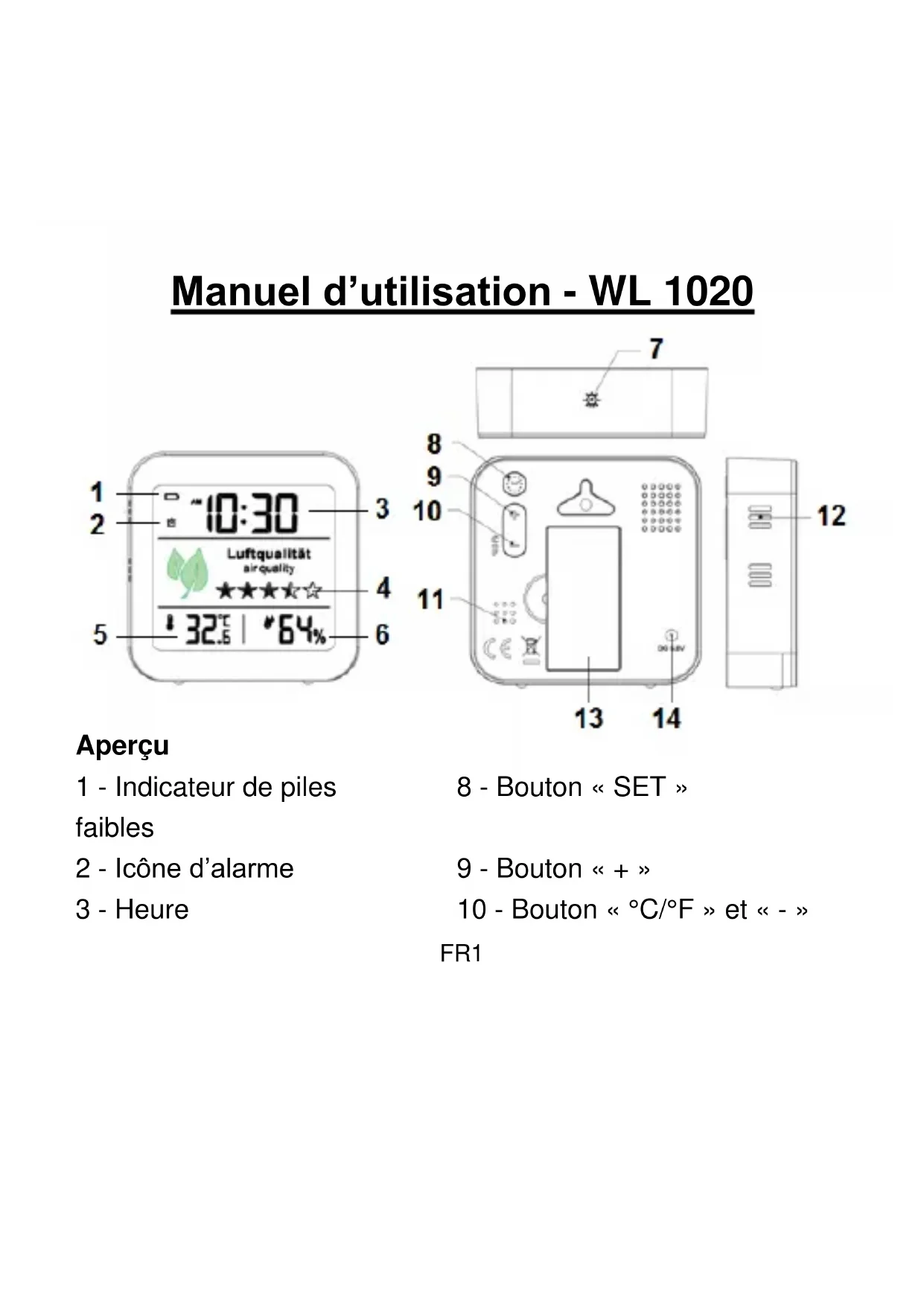 Fonctions principales Horloge à quartz Affichage de l’heure sur le format 12/24 heures Alarme avec fonction de répétition de 5 minutes Affichage de la température et de l’humidité intérieures Mémoire des valeurs MIN/MAX pour la température et l’humidité Affichage de la qualité de l’air sous forme de classementFR3 par 5 étoiles Indicateur de piles faibles Rétroéclairage blanc Passage au jaune : ventilation recommandée Passage au rouge : Le capteur de qualité de l’air (capteur de TVOC) mesure des valeurs très élevées et une ventilation est nécessaire d’urgence Mise en route : Utilisation avec adaptateur USB Utilisez uniquement l’adaptateur USB fourni pour connecter un appareil alimenté au WL 1020. Ou utilisez un adaptateur USB standard de 5,0 V/1 A (non inclus) pour connecter le câble de l’adaptateur USB à une prise de courant domestique.FR4 Utilisation avec piles Retirez le couvercle du compartiment à piles du WL 1020 et insérez 2 piles AAA en respectant la polarité [« + » et « - »]. Remettez le couvercle du compartiment à piles en place. Remarques Le capteur de qualité de l’air sera initialisé pendant environ 15 secondes, puis le classement de cinq étoiles pour la qualité de l’air sera mis à jour. Placez le WL 1020 correctement sur une surface plane avec suffisamment d’espace libre de tous les côtés. En procédant ainsi, le capteur de TVOC et le capteur hygro- thermique du WL 1020 peuvent obtenir les meilleurs résultats.FR5 Réglage de l’heure et de l’heure d’alarme En mode d’affichage normal, appuyez sur le bouton « SET » et maintenez-le enfoncé pendant 3 secondes pour accéder au mode de réglage. Appuyez sur le bouton « + » ou « - » pour effectuer les réglages et sur le bouton « SET » pour confirmer chaque réglage. Appuyez sur le bouton « + » ou « - » et maintenez-le enfoncé pour accélérer le processus et atteindre plus rapidement la valeur souhaitée. La séquence de réglage est affichée comme suit : affichage 12/24 heures -> heure -> minute -> heure de l’alarme -> minute de l’alarme -> quitter Remarque : L’appareil quitte le mode de réglage et revient au mode d’affichage normal après 10 secondes lorsqu’aucun réglage n’est effectué à l’aide de boutons.FR6 Activation/désactivation de l’alarme : Appuyez sur le bouton « SET » pour activer ou désactiver l’alarme. L’icône d’alarme s’affiche aussi longtemps que l’alarme est activée. Fonction d’alarme et de répétition : Lorsque l’alarme sonne, l’icône d’alarme clignote. Appuyez sur le bouton « LICHT » pour activer l’alarme de répétition (l’icône d’alarme clignote en permanence sur l’écran LCD) ou sur tout autre bouton pour la désactiver, elle sonnera à la même heure le jour suivant. Lorsque la fonction de répétition est active, appuyez sur un bouton quelconque, excepté le bouton « LICHT », pour arrêter l’alarme de répétition.FR7 Remarque : L’alarme sonne pendant 2 minutes et augmente en intensité avec le temps avant de s’arrêter automatiquement, si elle n’est pas interrompue en appuyant sur n’importe quel bouton. Température et humidité En mode d’affichage normal, appuyez sur le bouton « °C/°F » pour basculer entre l’affichage de température en °C et en °F. Température et humidité maximales/minimales En mode d’affichage normal, appuyez sur le bouton « + » pour afficher les valeurs maximales et minimales de température et d’humidité. MAX s’affiche lors de la visualisation des valeurs maximales et MIN s’affiche lorsFR8 de la visualisation des valeurs minimales. Informations sur le capteur de TVOC et de CO2 Le TVOC et le CO2 (dioxyde de CARBONE) adoptent des capteurs d’oxyde métallique avec une stabilité à long terme et une faible dérive. TVOC est l’abréviation de composés organiques volatils totaux, contenant des milliers de composés. CO2, le capteur ne détecte pas directement le CO2 dans l’environnement, mais la valeur approximative dérivée d’autres paramètres pertinents du capteur. Test de qualité de l’air Lorsque le WL 1020 est alimenté par un câble USB : Le capteur de la qualité de l’air (TVOC) est activé en permanence.FR9 Lorsque le WL 1020 est alimenté par des piles : Appuyez sur le bouton « LICHT » et maintenez-le enfoncé pendant 3 secondes pour activer le capteur. Cela permet de mettre à jour et d’afficher le classement de cinq étoiles pour la qualité de l’air dans un délai de 15 secondes. Le mode de test du capteur est désactivé au bout de 5 minutes afin d’économiser l’énergie et d’éviter que les piles ne se déchargent trop rapidement. L’affichage conservera l’état de la dernière mesure affichée à l’écran Affichage de la qualité de l’air La qualité de l’air est affichée par 5 symboles étoile, qui changent en fonction de la valeur mesurée du CO2 :FR10 Symboles affichés Plage de valeurs Qualité de l’air