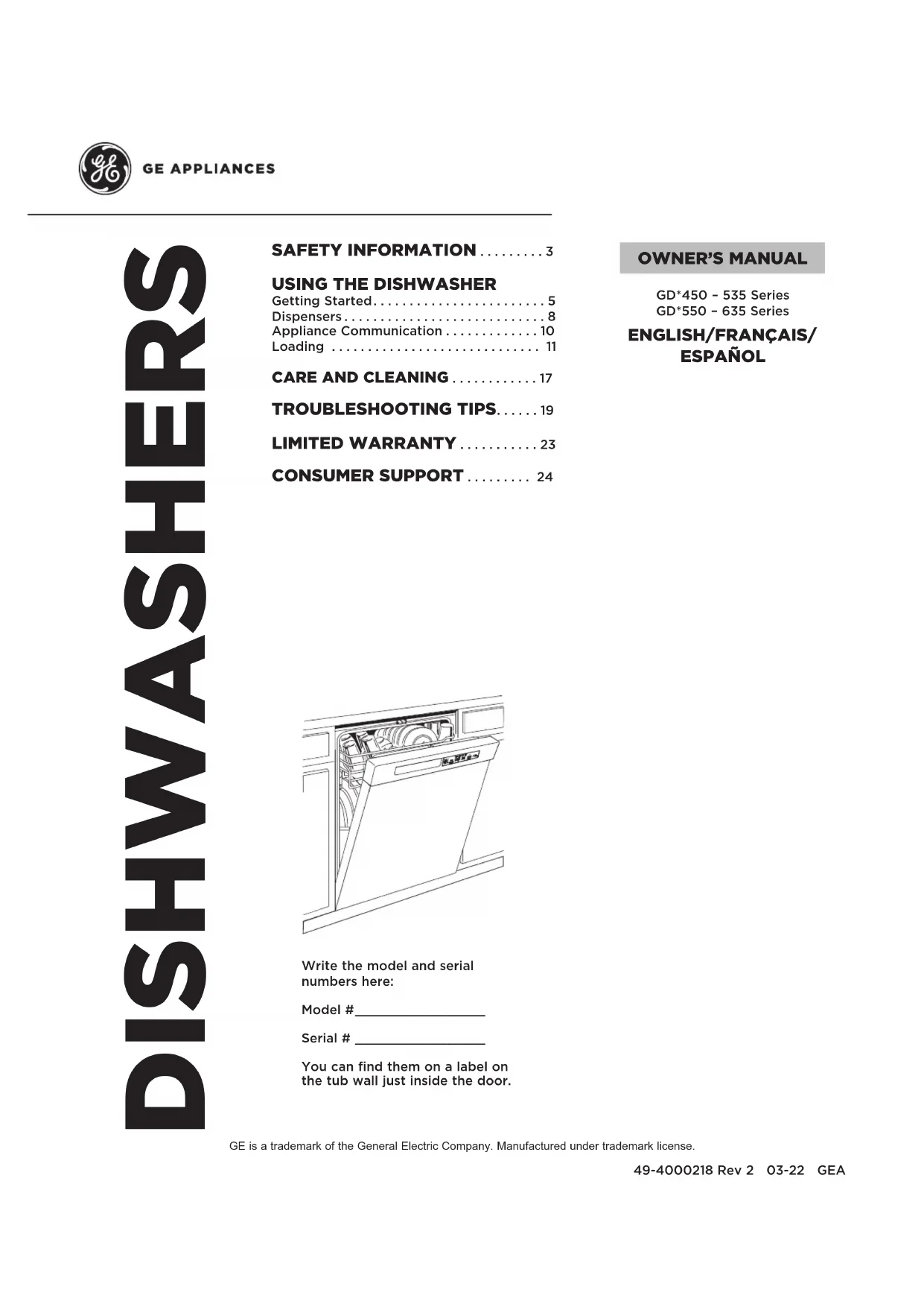 GD*450 – 535 Séries GD*550 – 635 Séries2 49-4000218 Rev 2 NOUS VOUS REMERCIONS D’ACCUEILLIR GE APPLIANCES CHEZ VOUS Que vous ayez grandi avec GE Appliances ou qu’il s’agisse de votre première acquisition, nous sommes heureux de vous accueillir dans notre famille. Nous sommes fiers du savoir-faire, de l’innovation et de l’esthétique qui composent chaque appareil GE Appliances, et nous pensons que vous le serez aussi. Dans cette optique, nous vous rappelons que l’enregistrement de votre électroménager vous assure la communication de renseignements importants sur le produit et la garantie lorsque vous en avez besoin. Enregistrez votre électroménager GE en ligne dès maintenant. Des sites Web et des numéros de téléphone utiles figurent dans la section Soutien au consommateur de ce manuel d’utilisation. Vous pouvez aussi poster la fiche de garantie préimprimée incluse dans l’emballage.49-4000218 Rev 2 3