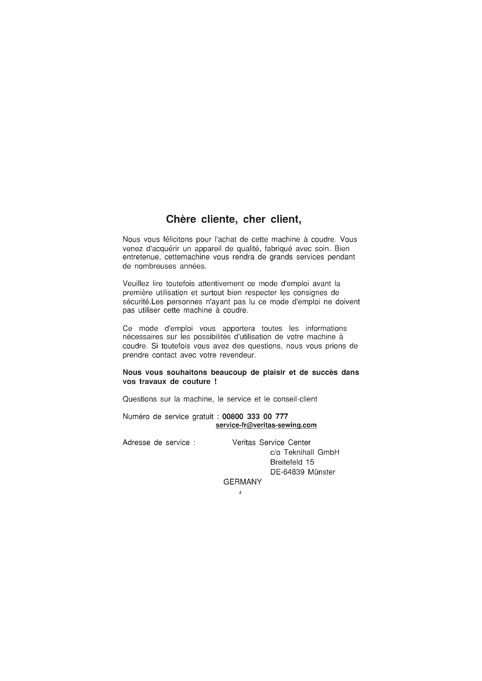 kostenlos zur Entsorgung entgegenzunehmen. Verwahren Sie diese Bedienungsanleitung Diese Nähmaschine ist nur für den Haushalt gedacht.4 Chère cliente, cher client, Nous vous félicitons pour l'achat de cette machine à coudre. Vous venez d'acquérir un appareil de qualité, fabriqué avec soin. Bien entretenue, cettemachine vous rendra de grands services pendant de nombreuses années. Veuillez lire toutefois attentivement ce mode d'emploi avant la première utilisation et surtout bien respecter les consignes de sécurité.Les personnes n'ayant pas lu ce mode d'emploi ne doivent pas utiliser cette machine à coudre. Ce mode d'emploi vous apportera toutes les informations nécessaires sur les possibilités d'utilisation de votre machine à coudre. Si toutefois vous avez des questions, nous vous prions de prendre contact avec votre revendeur. Nous vous souhaitons beaucoup de plaisir et de succès dans vos travaux de couture ! Questions sur la machine, le service et le conseil-client Numéro de service gratuit : 00800 333 00 777 service-fr@veritas-sewing.com Adresse de service : Veritas Service Center c/o Teknihall GmbH Breitefeld 15 DE-64839 Münster GERMANY5 Lors de l'utilisation d'un appareil électrique, suivez toujours des mesures de sécurité basiques, notamment : Lisez toutes les instructions avant d'utiliser cette machine à coudre et les conserver pour les relire ultérieurement. DANGER - Pour réduire les risques d'électrocution :