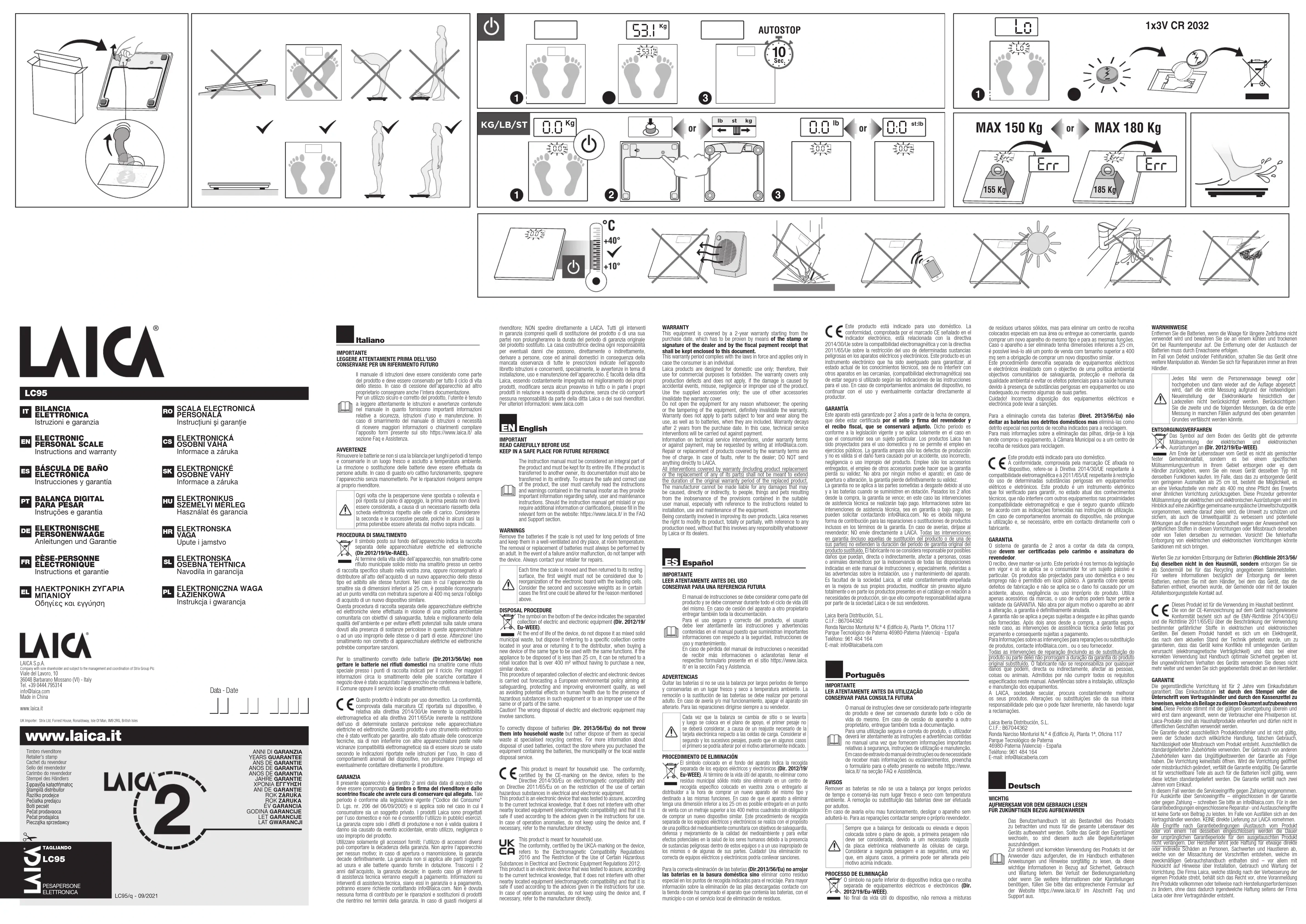 Le symbole placé sur le fond de l’appareil indique la récolte séparée des appareils électriques et électroniques (Dir. 2012/19/Eu-WEEE). A la fin de la vie utile de l’appareil, il ne faut pas l’éliminer comme déchet municipal solide mixte; il faut l’éliminer chez un centre de récolte spécifique situé dans votre zone ou bien le rendre au distributeur au moment de l’achat d’un nouveau appareil du même type et prévu pour les mêmes fonctions. Dans le cas où l’appareil à éliminer serait de dimensions inférieures à 25 cm, on peut le rendre à un point de vente ayant un métrage supérieur à 400 m² sans l’obligation d’acheter un nouveau dispositif similaire. Cette procédure de récolte séparée des appareils électriques et électroniques se réalise dans une vision d’une politique de sauvegarde, protection et amélioration de la qualité de l’environnement et pour éviter des effets potentiels sur la santé humaine dus à la présence de substances dangereuses dans ces appareils ou bien à un emploi non autorisé d’elles ou de leurs parties. Attention! Une élimination incorrecte des appareils électriques pourrait impliquer des pénalités. Pour la mise au rebut correcte des piles (Dir.2013/56/Eu), ne pas jeter les piles dans les déchets domestiques mais comme déchet spécial dans les points de collecte indiqués pour le recyclage. Pour plus d'informations concernant l'élimination des piles déchargées contacter le magasin où a été acheté l'appareil qui contenait les piles, la commune ou bien le service local d'élimination des déchets. Ce produit est indiqué pour un usage domestique. La conformité, attestée par le marquage CE sur l'appareil, concerne la directive 2014/30/UE sur la compatibilité électromagnétique et 2011/65/UE sur la limitation de l'utilisation de certaines substances dangereuses dans les équipements électriques et électroniques. Ce produit est un instrument électronique qui a été vérifié pour assurer, dans l'état actuel des connaissances techniques, à la fois de ne pas interférer avec d'autres équipements situés à proximité (compatibilité électromagnétique) et d'être sûr s'il est utilisé selon les indications indiquées dans ce mode d'emploi. En cas de comportement anormal de l'appareil, ne pas prolonger l'utilisation et éventuellement contacter le fabricant directement. GARANTIE Cet appareil est garanti pour une durée de 2 ans à partir de la date d’achat qui doit apparaître sur le tampon et la signature du revendeur et sur le reçu fiscal ci-joint que vous garderez avec soin. Cette période est conforme à la législation en vigueur et s’applique seulement au cas où le consommateur soit un sujet particulier. Les produits Laica sont projetés pour un emploi à la maison et on ne permet pas son emploi dans les locaux publiques. La garantie couvre uniquement les défauts de production et n’est pas valable si les dommages sont causés par des événements accidentels, par une utilisation incorrecte, par négligence ou par utilisation impropre du produit. Utiliser uniquement les accessoires fournis; l’utilisation d’accessoires divers peut entraîner l’annulation de la garantie. N’ouvrir en aucun cas l’appareil; en cas d’ouverture ou d’endommagement, la garantie sera annulée définitivement. La garantie n’est pas valide pour les pièces soumises à usure suite à leur emploi et aux batteries lorsqu’elles sont fournies en dotation. Une fois écoulés 2 ans dès la date d’achat, la garantie s’échoit; dans ce cas les interventions d’assistance technique seront réalisées sous paiement. Les informations sur les interventions d’assistance technique, soient elles en garantie ou sous paiement, pourront être demandées en contactant notre société à info@laica.com. Aucune forme de contribution est due pour les réparations et les remplacements inclus dans les termes de la garantie. En cas de pannes, s’adresser à son revendeur; NE PAS expédier directement à LAICA. Toutes les interventions en garantie (incluses celles de remplacement du produit ou bien d’une de ses parties) ne prolongeront pas la durée de la période de garantie originale du produit remplacé. La maison constructrice décline toute responsabilité en cas d’éventuels dommages causés, directement ou indirectement, aux personnes, choses et animaux domestiques suite au manque d’attention à toutes les prescriptions indiquées sur le livret d’instruction et concernant, de manière particulière, les conseils relatifs à l’installation, l’utilisation et l’entretien de l’appareil. Il est faculté de la société Laica, qui est constamment engagée dans l’amélioration de ses produits, de modifier sans aucun avis au préalable totalement ou partiellement ses propres produits en relation avec la nécessité de production, sans que cela implique aucune responsabilité de la part de la société Laica ou de ses vendeurs. EÏÏËÓÈο