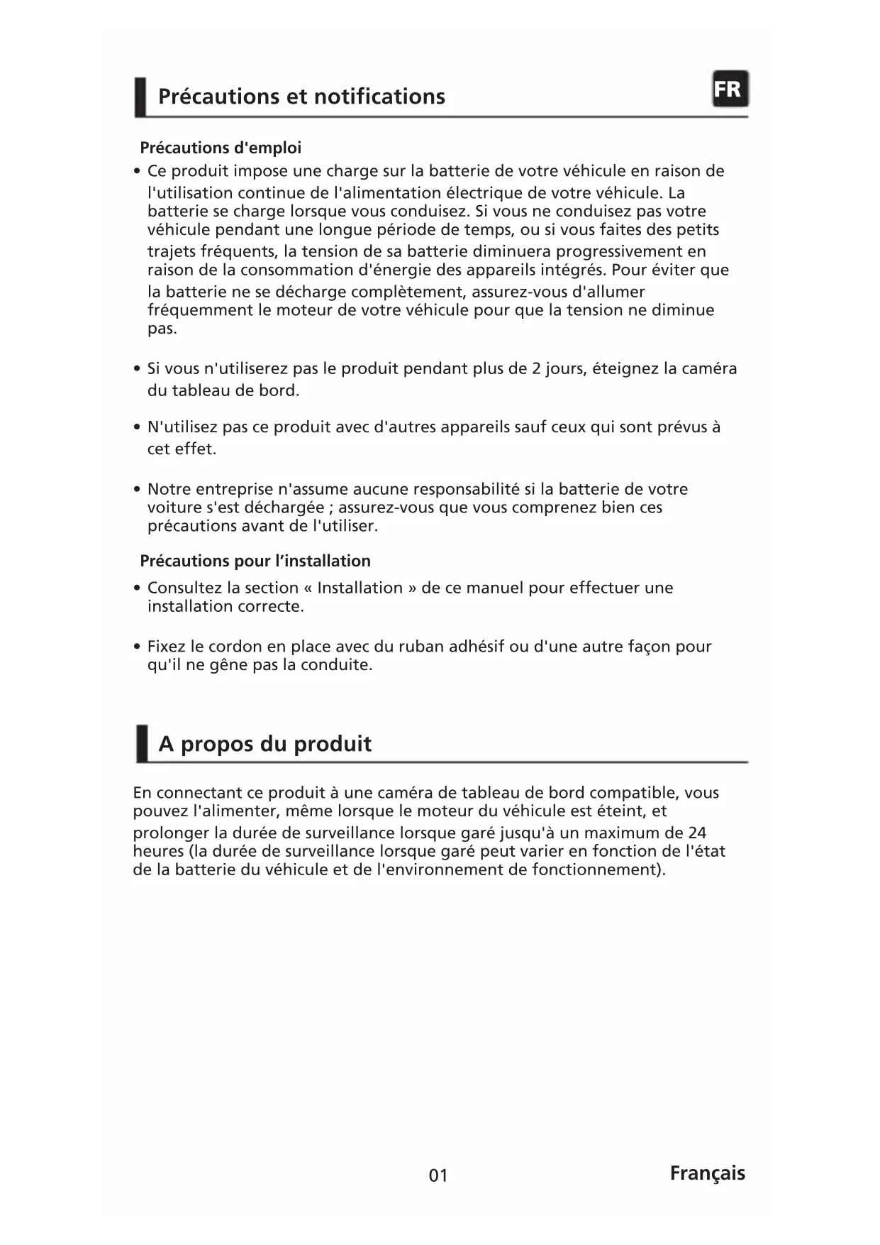 Précautions d'emploi Précautions pour l’installation A propos du produit En connectant ce produit à une caméra de tableau de bord compatible, vous pouvez l'alimenter, même lorsque le moteur du véhicule est éteint, et prolonger la durée de surveillance lorsque garé jusqu'à un maximum de 24 heures (la durée de surveillance lorsque garé peut varier en fonction de l'état de la batterie du véhicule et de l'environnement de fonctionnement).