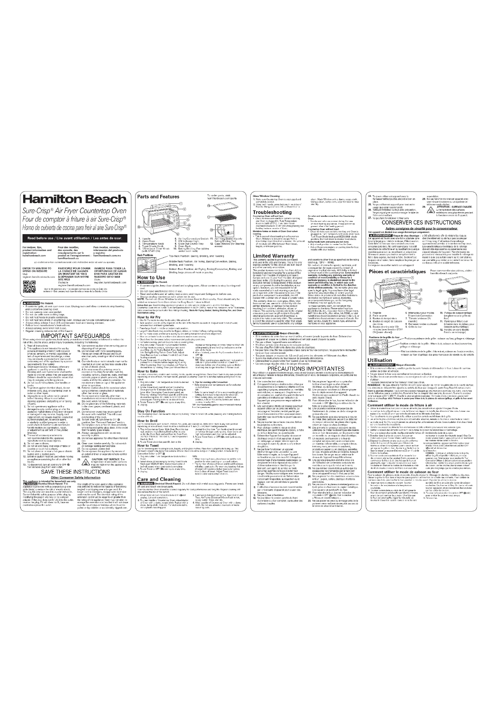ENTER TO WIN $100 TO SPEND ON WEBSITEVisit register.hamiltonbeach.com PARTICIPEZ POUR COURIR LA CHANCE DE GAGNER UN MONTANT DE 100 $ À DÉPENSER SUR NOTRE SITE WEBVisitez le register.hamiltonbeach.com INGRESE PARA TENER LA OPORTUNIDAD DE GANAR $100 PARA GASTAR EN NUESTRO SITIO WEBVisite register.hamiltonbeach.com Open to US customers only • Ce concours s’adresse aux clients des États-Unis seulement • Este concurso está disponible sólo a clientes de los Estados UnidosMiddle Rack Position: Air Frying, Baking/Convection, Baking, Broiling, and ToastingBottom Rack Position: Air Frying, Baking/Convection, Baking and Broiling large pieces of meat or poultryRack Positionsw AVERTISSEMENT Risque d’incendie.• Si le contenu de votre four se met à brûler, n’ouvrez jamais la porte du four. Debrancher l’appareil et laisser le contenu s’éteindre et refroidir avant d’ouvrir la porte.• Ne pas utiliser l’appareil sans surveillance.• N’utilisez jamais avec des sacs de cuisson au four.• Ne pas chauffer d’aliments dans des plats de plastique.