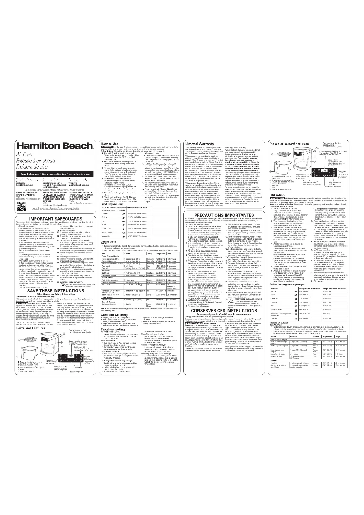La température est trop basse. Augmenter la température et poursuivre la cuisson. L’aliment n’est pas cuit uniformément.• Il y a une trop grande quantité d’aliments sur l’accessoire pour friture. Secouer les aliments à mi-cuisson ou plus fréquemment si nécessaire.Les légumes frais ne sont pas suffisamment croustillants.• Le temps de cuisson est trop court. Augmenter le temps de cuisson et poursuivre la cuisson.• Vaporiser légèrement les aliments frais avec de l’huile donnera des résultats plus croustillants.• La température est trop basse. Augmenter la température et poursuivre la cuisson.Les frites ne sont pas croustillantes.• Ajouter une petite quantité d’huile végétale, suffisamment pour enduire légèrement les pommes de terre. • Les morceaux sont trop gros. Couper des plus petits morceaux la prochaine fois.De la fumée se dégage de la friteuse à air chaud.• L’excès d’huile a dégoutté sur la casserole ou a éclaboussé les serpentins de chauffage. Utiliser seulement de petites quantités d’huile dans la friteuse à air chaud.La viande ou la volaille n’est pas suffisamment cuite.• Il y a une trop grande quantité d’aliments sur l’accessoire pour friture. La viande et la volaille doivent reposer en une seule couche pour cuire uniformément. Se reporter au site Web gouvernemental pour connaître les températures de cuisson appropriées. Garantie limitée Cette garantie s’applique aux produits achetés et utilisées aux É.-U. et au Canada. C’est la seule garantie expresse pour ce produit et est en lieu et place de tout autre garantie ou condition. Ce produit est garanti contre tout défaut de matériaux et de main-d’oeuvre pour une période de cinq (5) ans à compter de la date d’achat d’origine au Canada et un (1) an à compter de la date d’achat d’origine aux É.-U. Au cours de cette période, votre recours exclusif se limitera au remplacement de ce produit ou tout autre composant défectueux, à notre discrétion. Cependant, vous êtes responsables des frais associés au retour du produit ou d’un composant en vertu de la présente garantie. Si le produit ou le composant est non disponible, nous le remplacerons avec un article similaire de valeur égale ou supérieure.Cette garantie ne couvre pas le verre, les filtres, l’usure d’un usage normal, l’utilisation non conforme aux directives imprimées, ou des dommages au produit résultant d’un accident, modification, utilisation abusive ou incorrecte. Cette garantie s’applique seulement à l’acheteur original ou à la personne l’ayant reçu en cadeau. La présentation du reçu de vente d’origine comme preuve d’achat est nécessaire pour faire une réclamation au titre de cette garantie. Cette garantie s’annule si le produit est utilisé autrement que par une famille ou si l’appareil est soumis à toute tension ou forme d’onde différente des caractéristiques nominales précisées sur l’étiquette (par ex. : 120 V ~ 60 Hz).Nous excluons toutes les réclamations au titre de cette garantie pour les dommages spéciaux, consécutifs et indirects causés par la violation de garantie expresse ou implicite. Toute responsabilité est limitée au prix d’achat. Chaque garantie implicite, y compris toute garantie ou condition de qualité marchande ou d’adéquation à un usage particulier, est exonérée, sauf dans la mesure interdite par la loi, auquel cas la garantie ou condition est limitée à la durée de cette garantie écrite. Cette garantie vous donne des droits légaux précis. Vous pouvez avoir d’autres droits qui varient selon l’endroit où vous habitez. Certaines provinces ne permettent pas les limitations sur les garanties implicites ou les dommages spéciaux ou indirects de telle sorte que les limitations ci-dessus ne s’appliquent peut-être pas à votre cas.Pour faire une réclamation au titre de la garantie, veuillez ne pas retourner cet appareil au magasin. Veuillez nous écrire à Hamilton Beach Brands, Inc., Customer Service Department, 4421 Waterfront Dr., Glen Allen, VA 23060, ou visiter le site hamiltonbeach.com/customer-service aux États-Unis ou hamiltonbeach.ca/customer-service au Canada. Pour obtenir un service plus rapide, veuillez repérer les numéros de modèle, de type et de séries sur votre appareil.