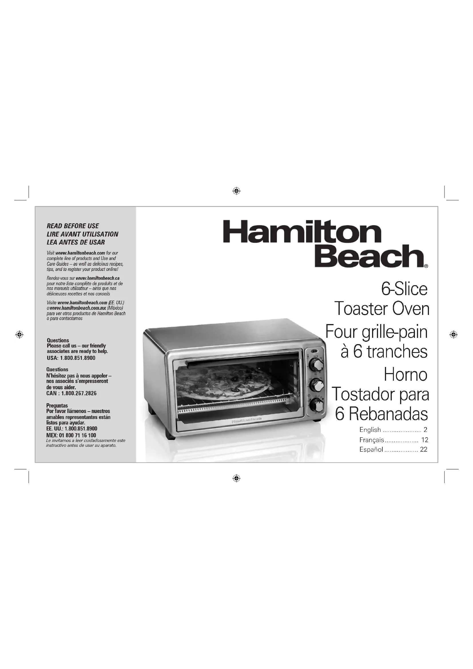 - Régler la température du four ou le temps de cuisson pour obtenir des résultats optimaux selon les recettes utilisées.20 Notes21 Garantie limitée Cette garantie s’applique aux produits achetés et utilisées aux É.-U. et au Canada. C’est la seule garantie expresse pour ce produit et est en lieu et place de tout autre garantie ou condition. Ce produit est garanti contre tout défaut de matériaux et de main-d’oeuvre pour une période des cinq (5) ans à compter de la date d’achat d’origine au Canada et un (1) an à compter de la date d’achat d’origine aux É.-U. Au cours de cette période, votre seul recours est la réparation ou le remplacement de ce produit ou tout composant s’avérant défectueux, à notre gré, mais vous êtes responsable de tous les coûts liés à l’expédition du produit et le retour d’un produit ou d’un composant dans le cadre de cette garantie. Si le produit ou un composant n’est plus offert, nous le remplacerons par un produit similaire de valeur égale ou supérieure. Cette garantie ne couvre pas le verre, les filtres, l’usure d’un usage normal, l’utilisation non conforme aux directives imprimées, ou des dommages au produit résultant d’un accident, modification, utilisation abusive ou incorrecte. Cette garantie s’applique seulement à l’acheteur original ou à la personne l’ayant reçu en cadeau. La présentation du reçu de vente d’origine comme preuve d’achat est nécessaire pour faire une réclamation au titre de cette garantie. Cette garantie s’annule si le produit est utilisé autrement que par une famille ou si l’appareil est soumis à toute tension ou forme d’onde différente des caractéristiques nominales précisées sur l’étiquette (par ex. : 120 V ~ 60 Hz). Nous excluons toutes les réclamations au titre de cette garantie pour les dommages spéciaux, consécutifs et indirects causés par la violation de garantie expresse ou implicite. Toute responsabilité est limitée au prix d’achat. Chaque garantie implicite, y compris toute garantie ou condition de qualité marchande ou d’adéquation à un usage particulier, est exonérée, sauf dans la mesure interdite par la loi, auquel cas la garantie ou condition est limitée à la durée de cette garantie écrite. Cette garantie vous donne des droits légaux précis. Vous pouvez avoir d’autres droits qui varient selon l’endroit où vous habitez. Certaines provinces ne permettent pas les limitations sur les garanties implicites ou les dommages spéciaux ou indirects de telle sorte que les limitations ci-dessus ne s’appliquent peut-être pas à votre cas. Ne pas retourner cet appareil au magasin lors d’une réclamation au titre de cette garantie. Téléphoner au 1.800.851.8900 aux É.-U. ou au 1.800.267.2826 au Canada ou visiter le site internet www.hamiltonbeach.com aux É.-U. ou www.hamiltonbeach.ca au Canada. Pour un service plus rapide, trouvez le numéro de modèle, le type d’appareil et les numéros de série sur votre appareil.2222 SALVAGUARDIAS IMPORTANTES