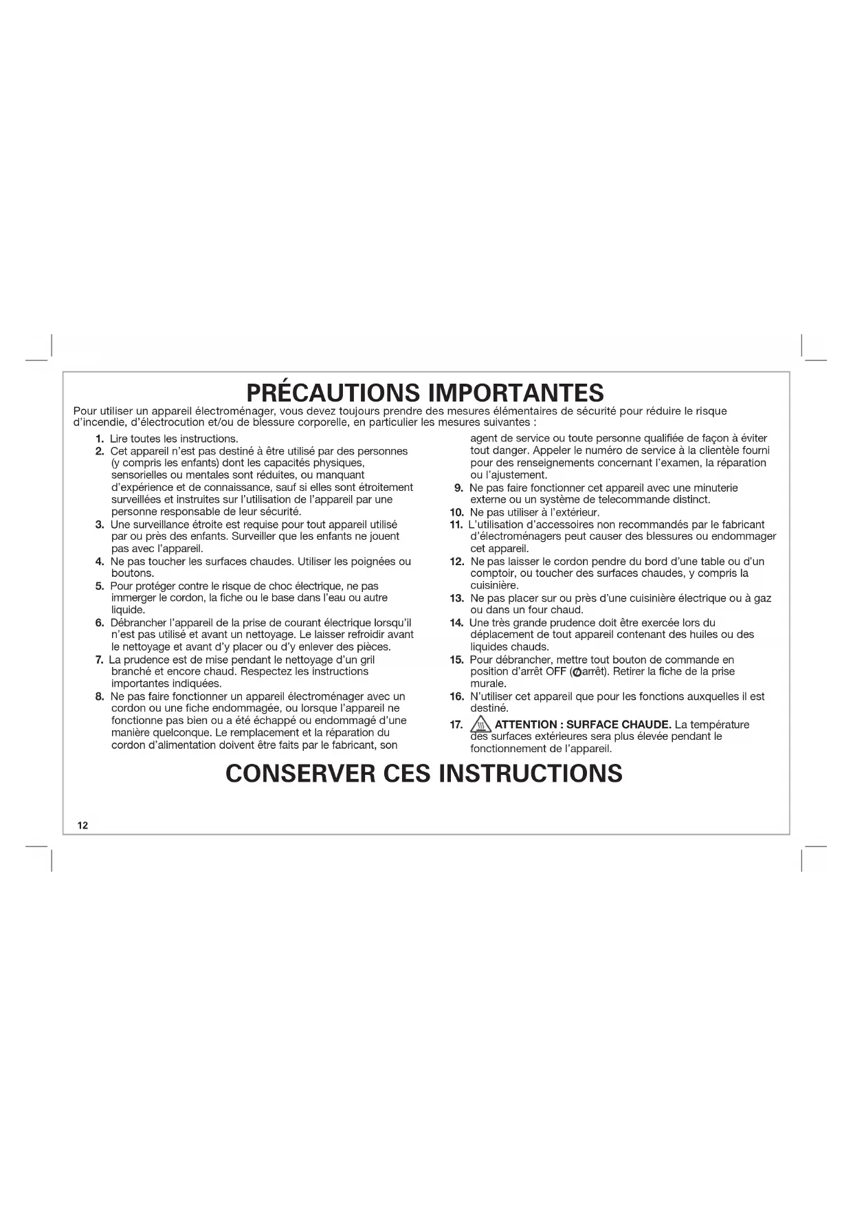 Autre consignes de sécurité pour le consommateur Cet appareil est destiné à un usage domestique uniquement. w AVERTISSEMENT Risque de choc électrique : Cet appareil est doté d’une fiche polarisée (lame plus large) ou d’une fiche (3 lames et mise à la terre) pour réduire le risque d’électrocution. Cette fiche s’insère d’une seule manière dans une prise polarisée ou prise avec mise à la terre. Ne pas transformer le dispositif de sécurité de la fiche en modifiant celle-ci de quelconque façon ou en utilisant un adaptateur. Si vous ne pouvez pas insérer complètement la fiche dans la prise, inversez la fiche. Si elle refuse toujours de s’insérer, faire remplacer la prise par un électricien. La longueur du cordon installé sur cet appareil a été sélectionnée afin de réduire les risques d’enchevêtrement ou de faux pas causés par un fil trop long. L’utilisation d’une rallonge approuvée est permise si le cordon est trop court. Les caractéristiques électriques de la rallonge doivent être équivalentes ou supérieures aux caractéristiques de l’appareil. Prendre toutes les précautions nécessaires pour installer la rallonge de manière à ne pas la faire courir sur le comptoir ou sur une table pour éviter qu’un enfant ne tire sur le cordon ou trébuche accidentellement. La rallonge électrique doit toujours être branchée à l’appareil en premier, avant d’être branchée à la prise. Pour éviter la surcharge du circuit électrique, ne pas utiliser un autre appareil à haute puissance sur le même circuit que cet appareil. Ce gril est conçu pour être utilisé en position fermée UNIQUEMENT. Ne pas utiliser le mode de Sear (grillage) pour les sandwichs et autres aliments semblables. Ne pas ranger ce gril verticalement sur le côté ou sur son endos. Pour éviter les brûlures, toujours utiliser un gant de cuisinier lorsque vous ouvrez le gril.14 Poignée Panneau de commandes Grilles de cuisson antiadhésives Couvercle Godet de récupération Goulotte Bouton de Sear