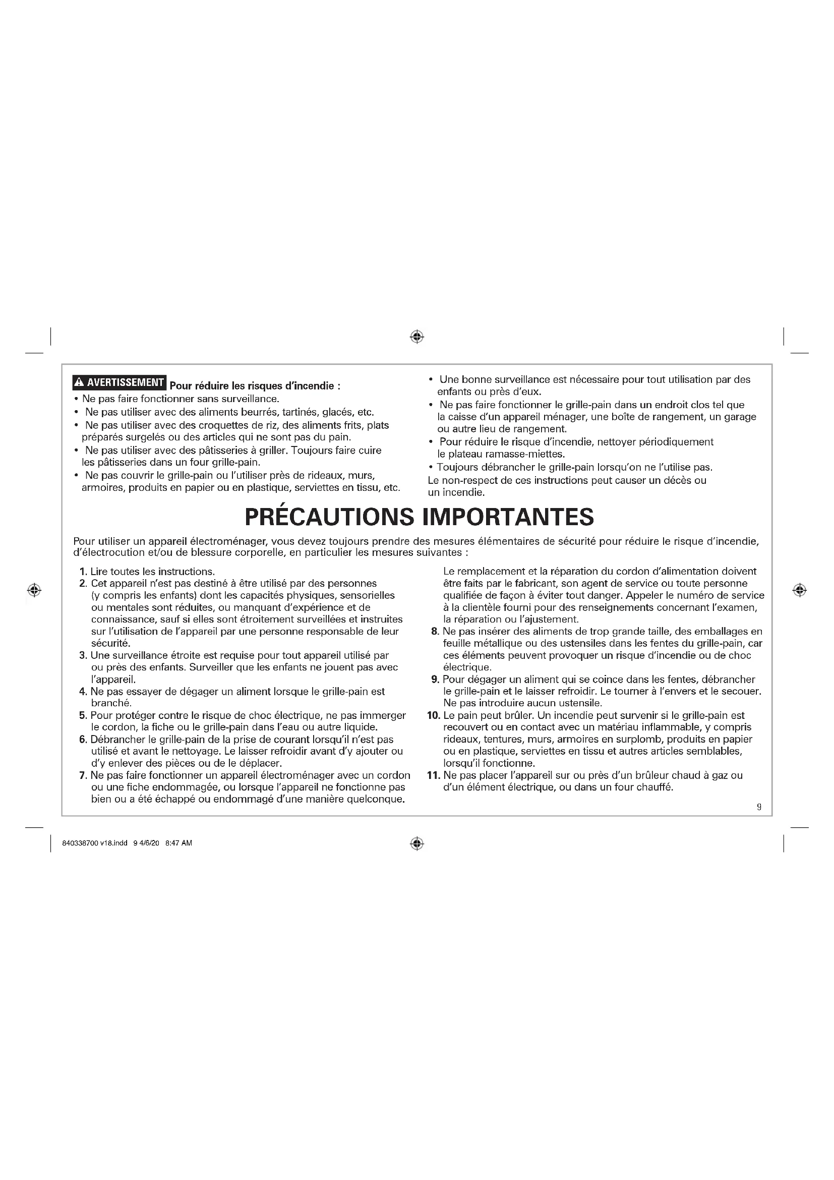 - Toujours débrancher le grille-pain lorsqu’on ne l’utilise pas. Le non-respect de ces instructions peut causer un décès ou un incendie. 840338700 v18.indd 9 4/6/20 8:47 AM10 Autres consignes de sécurité pour le consommateur Cet appareil est destiné à un usage domestique uniquement. w AVERTISSEMENT Risque de choc électrique : Cet appareil est fourni avec une fiche polarisée (une broche large) pour réduire le risque d’électrocution. Cette fiche n’entre que dans un seul sens dans une prise polarisée. Ne contrecarrez pas l’objectif sécuritaire de cette fiche en la modifiant de quelque manière que ce soit ou en utilisant un adaptateur. Si vous ne pouvez pas insérer complètement la fiche dans la prise, inversez la fiche. Si elle refuse toujours de s’insérer, faire remplacer la prise par un électricien. La longueur du cordon installé sur cet appareil a été sélectionnée afin de réduire les risques d’enchevêtrement ou de faux pas causés par un fil trop long. L’utilisation d’une rallonge approuvée est permise si le cordon est trop court. Les caractéristiques électriques de la rallonge doivent être équivalentes ou supérieures aux caractéristiques de l’appareil. Prendre toutes les précautions nécessaires pour installer la rallonge de manière à ne pas la faire courir sur le comptoir ou sur une table pour éviter qu’un enfant ne tire sur le cordon ou trébuche accidentellement. Pour éviter la surcharge du circuit électrique, ne pas utiliser un autre appareil à haute puissance sur le même circuit de cet appareil.