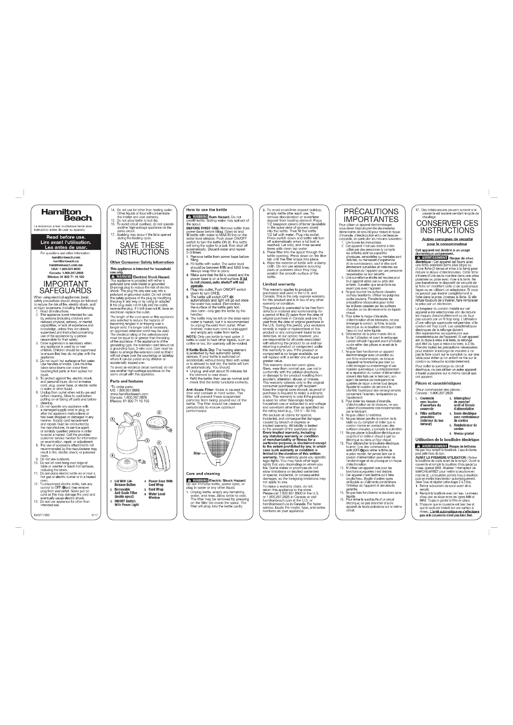 cloth. Do not use abrasive scouring pads or powders since they may scratch the smooth surface of the kettle. *To order parts: US: 1.800.851.8900 www.hamiltonbeach.com Canada: 1.800.267.2826 Mexico: 01 800 71 16 100 PRÉCAUTIONS IMPORTANTES Pour utiliser un appareil électroménager, vous devez toujours prendre des mesures élémentaires de sécurité pour réduire le risque d’incendie, d’électrocution et/ou de blessure corporelle, en particulier les mesures suivantes :