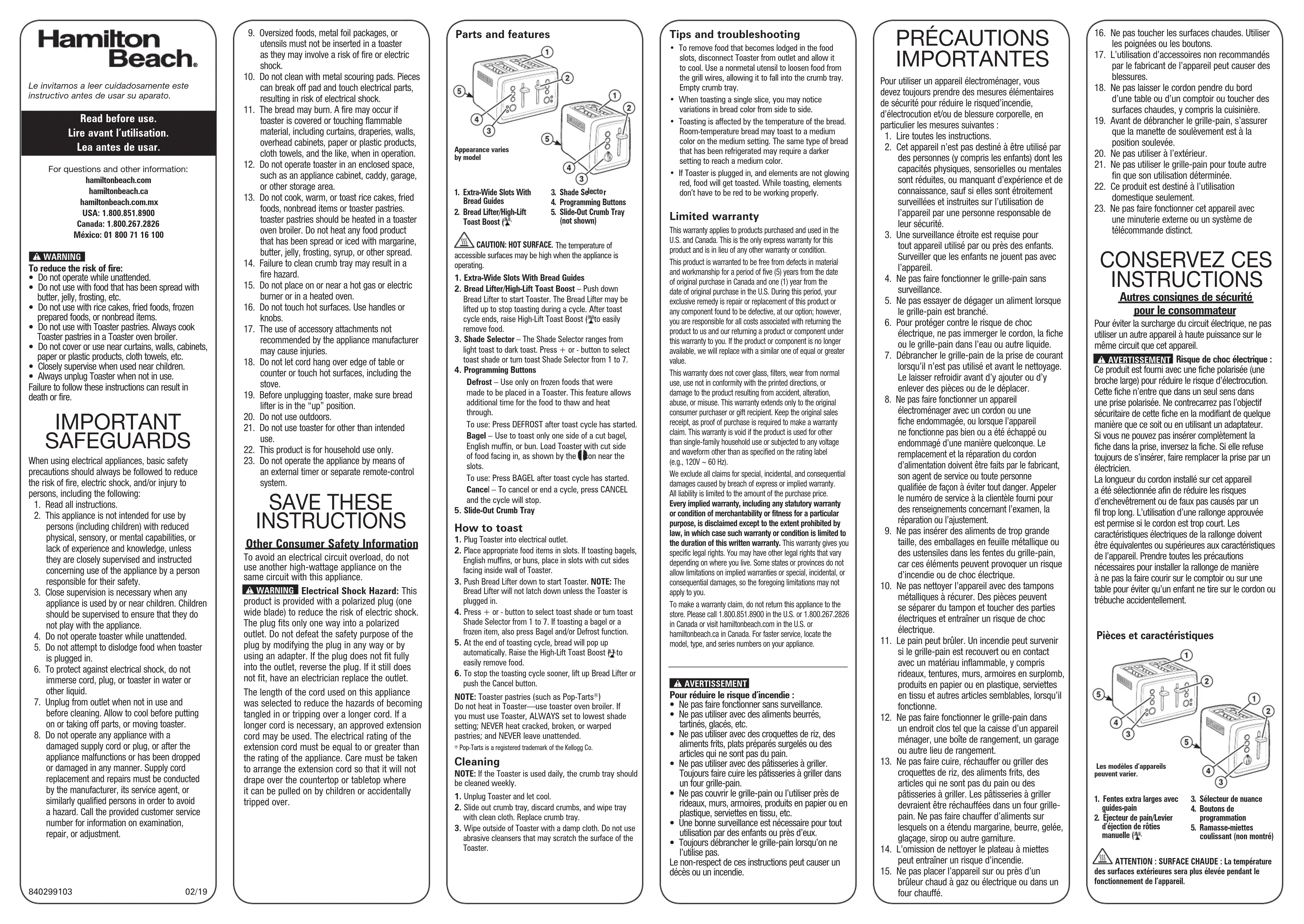 - Toujours débrancher le grille-pain lorsqu’on ne l’utilise pas. Le non-respect de ces instructions peut causer un décès ou un incendie. Other Consumer Safety Information To avoid an electrical circuit overload, do not use another high-wattage appliance on the same circuit with this appliance. w WARNING Electrical Shock Hazard: This product is provided with a polarized plug (one wide blade) to reduce the risk of electric shock. The plug fits only one way into a polarized outlet. Do not defeat the safety purpose of the plug by modifying the plug in any way or by using an adapter. If the plug does not fit fully into the outlet, reverse the plug. If it still does not fit, have an electrician replace the outlet. The length of the cord used on this appliance was selected to reduce the hazards of becoming tangled in or tripping over a longer cord. If a longer cord is necessary, an approved extension cord may be used. The electrical rating of the extension cord must be equal to or greater than the rating of the appliance. Care must be taken to arrange the extension cord so that it will not drape over the countertop or tabletop where it can be pulled on by children or accidentally tripped over. This warranty applies to products purchased and used in the U.S. and Canada. This is the only express warranty for this product and is in lieu of any other warranty or condition. This product is warranted to be free from defects in material and workmanship for a period of five (5) years from the date of original purchase in Canada and one (1) year from the date of original purchase in the U.S. During this period, your exclusive remedy is repair or replacement of this product or any component found to be defective, at our option; however, you are responsible for all costs associated with returning the product to us and our returning a product or component under this warranty to you. If the product or component is no longer available, we will replace with a similar one of equal or greater value. This warranty does not cover glass, filters, wear from normal use, use not in conformity with the printed directions, or damage to the product resulting from accident, alteration, abuse, or misuse. This warranty extends only to the original consumer purchaser or gift recipient. Keep the original sales receipt, as proof of purchase is required to make a warranty claim. This warranty is void if the product is used for other than single-family household use or subjected to any voltage and waveform other than as specified on the rating label (e.g., 120V ~ 60 Hz). We exclude all claims for special, incidental, and consequential damages caused by breach of express or implied warranty. All liability is limited to the amount of the purchase price. Every implied warranty, including any statutory warranty or condition of merchantability or fitness for a particular purpose, is disclaimed except to the extent prohibited by law, in which case such warranty or condition is limited to the duration of this written warranty. This warranty gives you specific legal rights. You may have other legal rights that vary depending on where you live. Some states or provinces do not allow limitations on implied warranties or special, incidental, or consequential damages, so the foregoing limitations may not apply to you. To make a warranty claim, do not return this appliance to the store. Please call 1.800.851.8900 in the U.S. or 1.800.267.2826 in Canada or visit hamiltonbeach.com in the U.S. or hamiltonbeach.ca in Canada. For faster service, locate the model, type, and series numbers on your appliance. Pour utiliser un appareil électroménager, vous devez toujours prendre des mesures élémentaires de sécurité pour réduire le risqued’incendie, d’électrocution et/ou de blessure corporelle, en particulier les mesures suivantes :