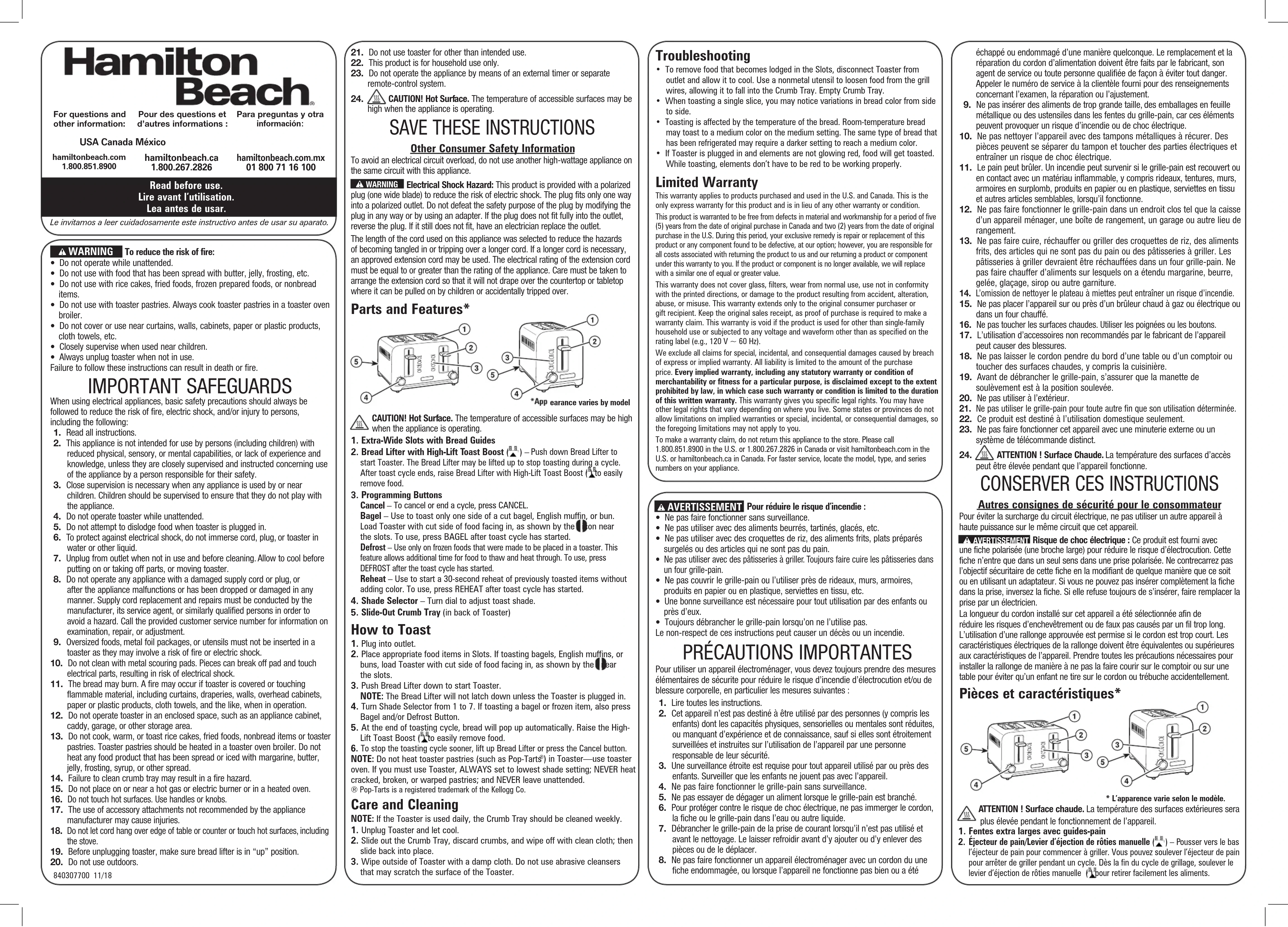 - Si el tostador está enchufado, y los elementos no brillan de color rojo, los alimentos se tostarán. Durante el tostado, los elementos no tienen que brillar en color rojo para funcionar correctamente. Nous excluons toutes les réclamations au titre de cette garantie pour les dommages spéciaux, consécutifs et indirects causés par la violation de garantie expresse ou implicite. Toute responsabilité est limitée au prix d’achat. Chaque garantie implicite, y compris toute garantie ou condition de qualité marchande ou d’adéquation à un usage particulier, est exonérée, sauf dans la mesure interdite par la loi, auquel cas la garantie ou condition est limitée à la durée de cette garantie écrite. Cette garantie vous donne des droits légaux précis. Vous pouvez avoir d’autres droits qui varient selon l’endroit où vous habitez. Certaines provinces ne permettent pas les limitations sur les garanties implicites ou les dommages spéciaux ou indirects de telle sorte que les limitations ci-dessus ne s’appliquent peut-être pas à votre cas.Ne pas retourner cet appareil au magasin lors d’une réclamation au titre de cette garantie. Téléphoner au 1.800.851.8900 aux É.-U. ou au 1.800.267.2826 au Canada ou visiter le site internet www.hamiltonbeach.com aux É.-U. ou www.hamiltonbeach.ca au Canada. Pour un service plus rapide, trouvez le numéro de modèle, le type d’appareil et les numéros de série sur votre appareil.