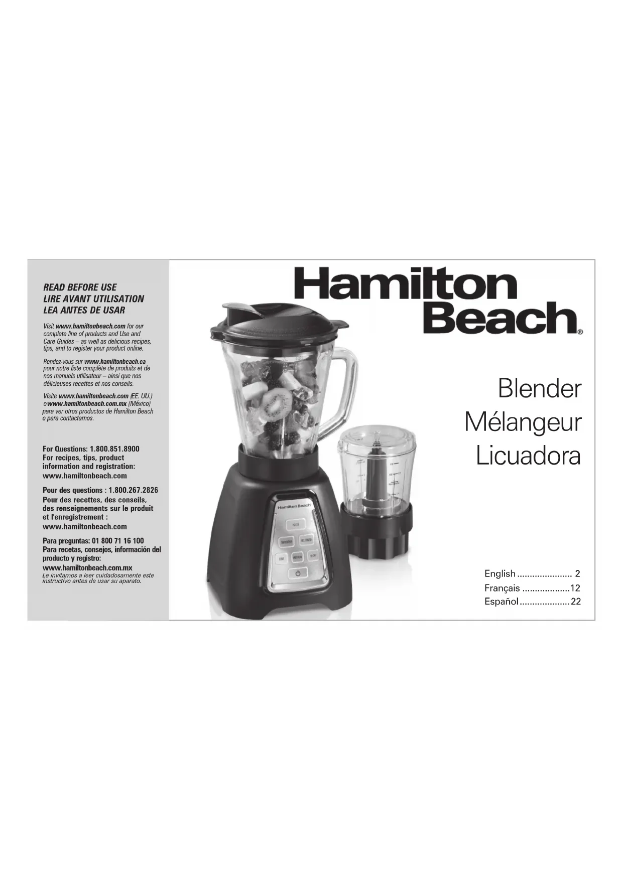 Visit www.hamiltonbeach.com for our complete line of products and Use and Care Guides – as well as delicious recipes, tips, and to register your product online. Rendez-vous sur www.hamiltonbeach.ca pour notre liste complète de produits et de nos manuels utilisateur – ainsi que nos délicieuses recettes et nos conseils. Visite www.hamiltonbeach.com ( EE. UU.)