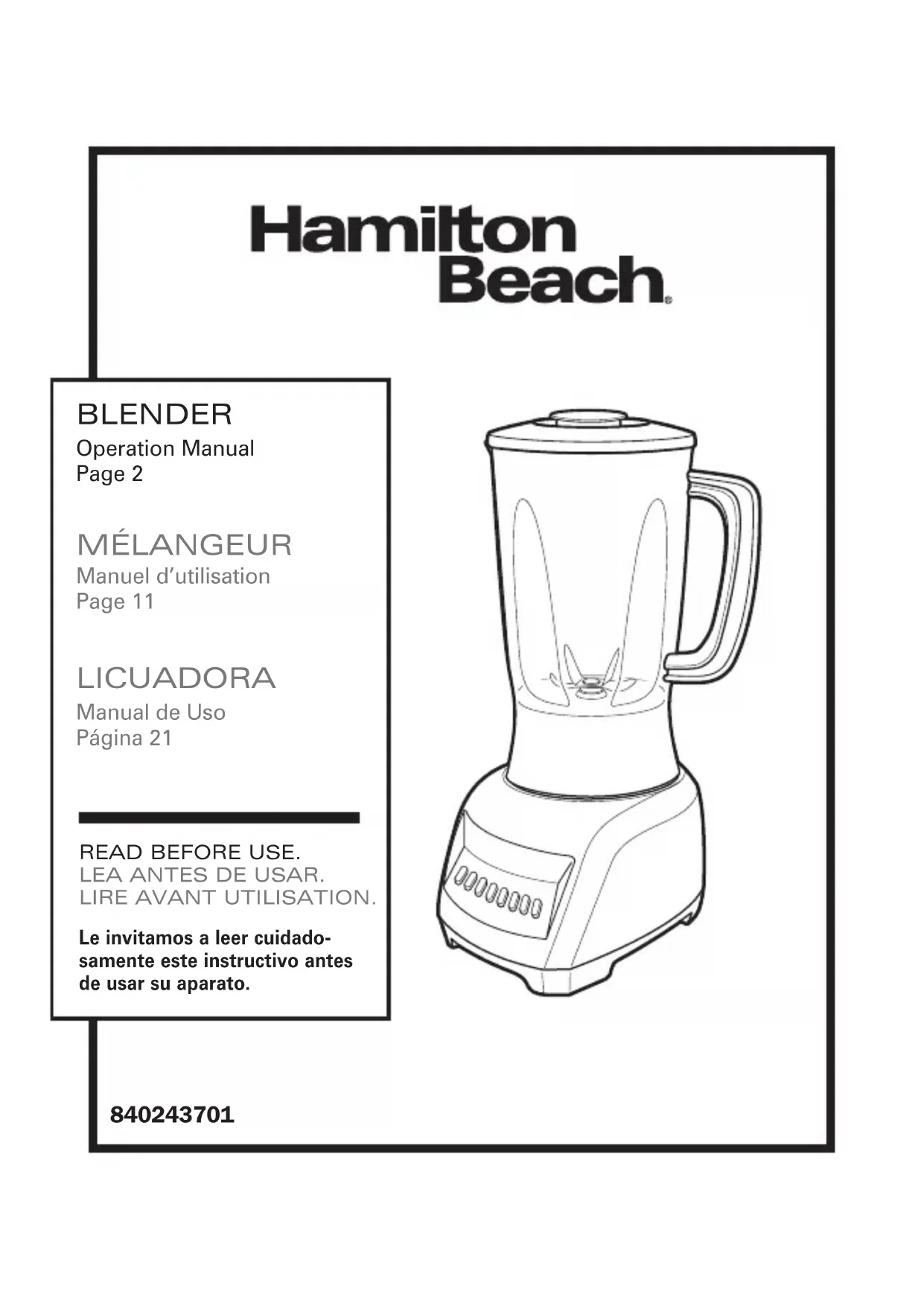 Téléchargez la notice de votre Blender au format PDF gratuitement ! Retrouvez votre notice 50123 - HAMILTON BEACH et reprennez votre appareil électronique en main. Sur cette page sont publiés tous les documents nécessaires à l'utilisation de votre appareil 50123 de la marque HAMILTON BEACH.