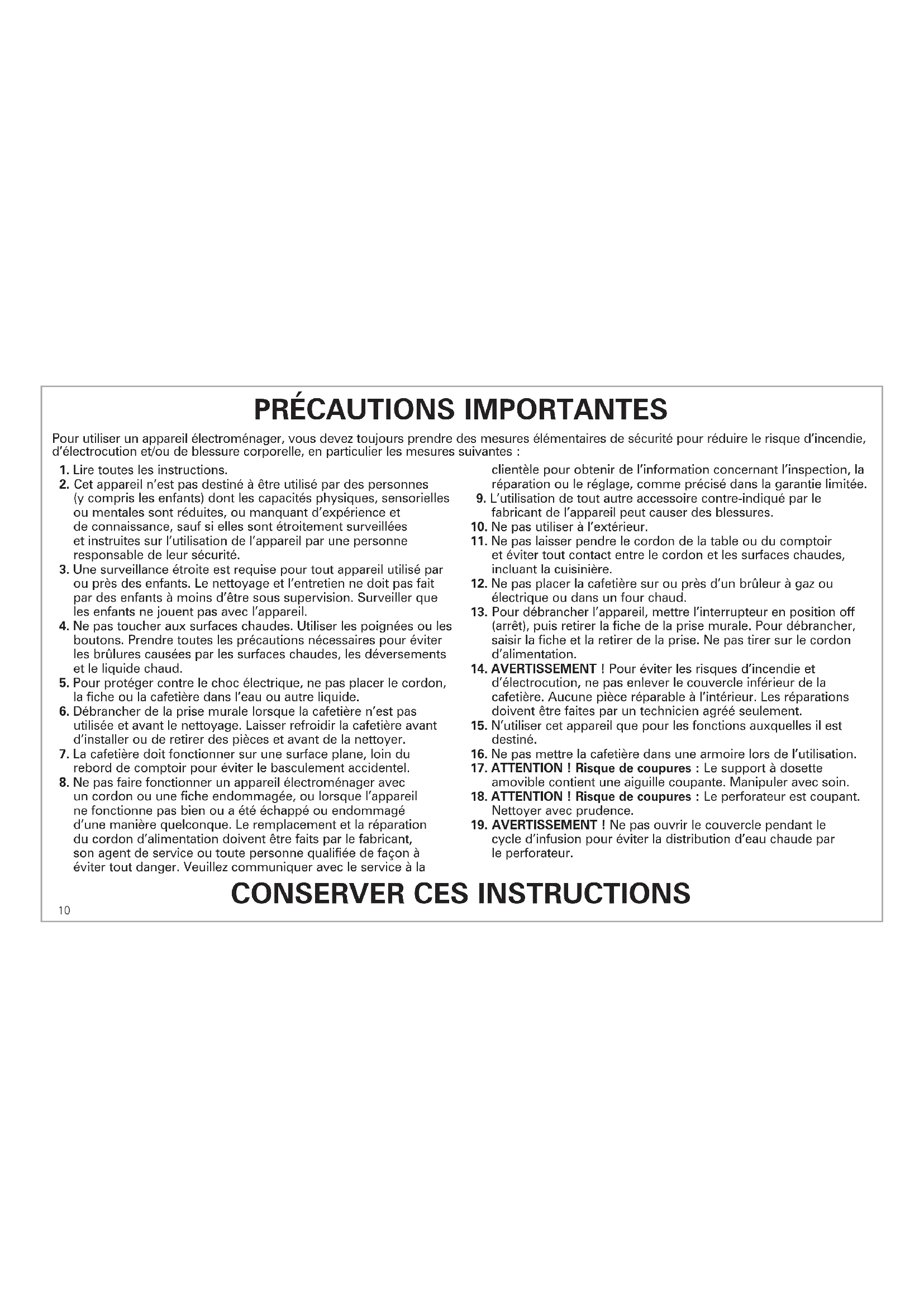 d’électrocution, ne pas enlever le couvercle inférieur de la cafetière. Aucune pièce réparable à l’intérieur. Les réparations doivent être faites par un technicien agréé seulement.